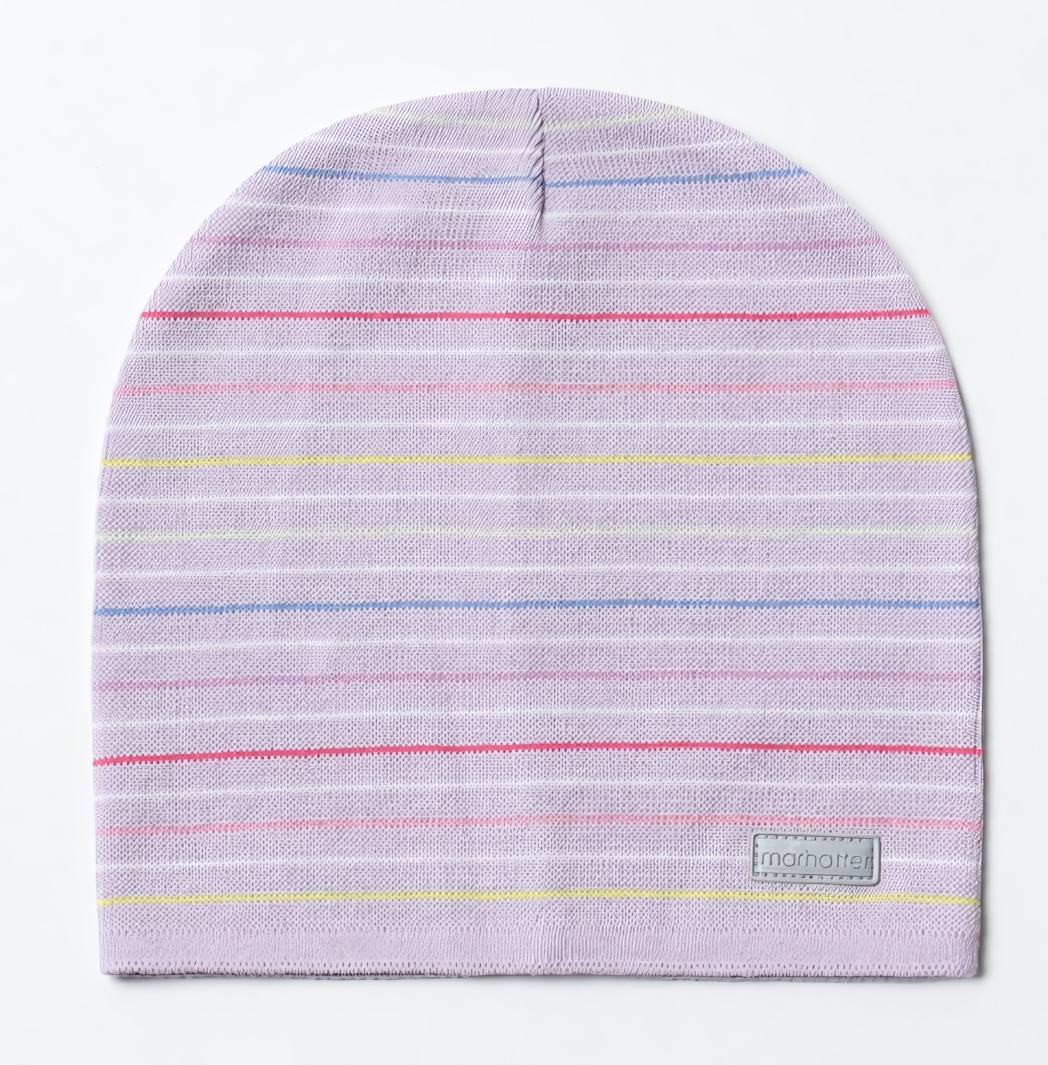 Светло-фиолетовая основа сочетается с горизонтальными тонкими полосами нежных цветов — розового, жёлтого, белого и синего, создавая игривый и стильный акцент. Шапка легко комбинируется с различной верхней одеждой и аксессуарами, а её приятная цветовая палитра подчеркивает индивидуальность маленькой модницы.