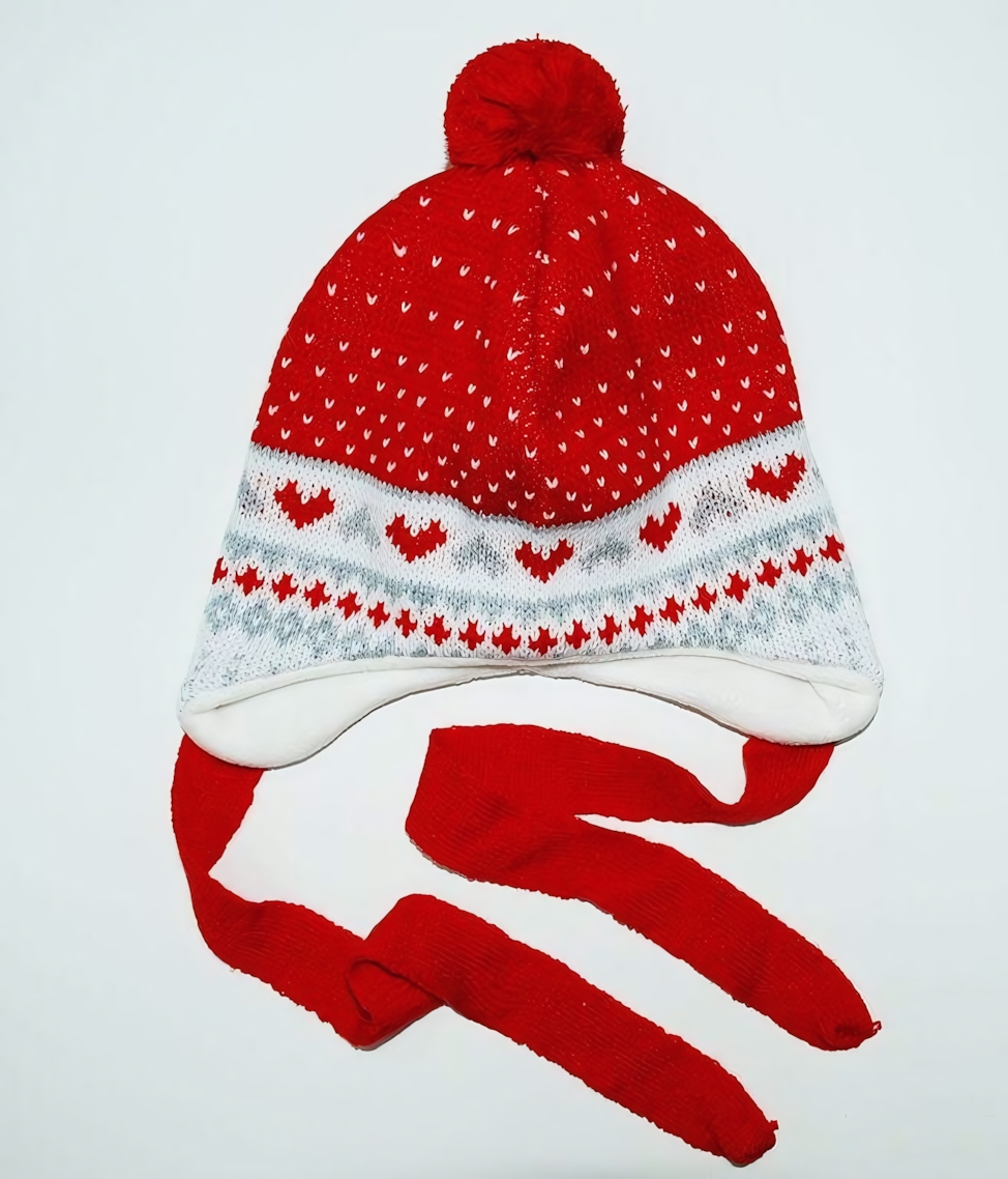 Шапка оснащена удобными завязками, которые закрепляют её на голове, предотвращая соскальзывание. Ушки тщательно закрывают область возле лица и ушей, сохраняя тепло. Яркий помпон и красочный орнамент с сердцами делают аксессуар привлекательным для детей и добавляют игривый, радостный акцент.