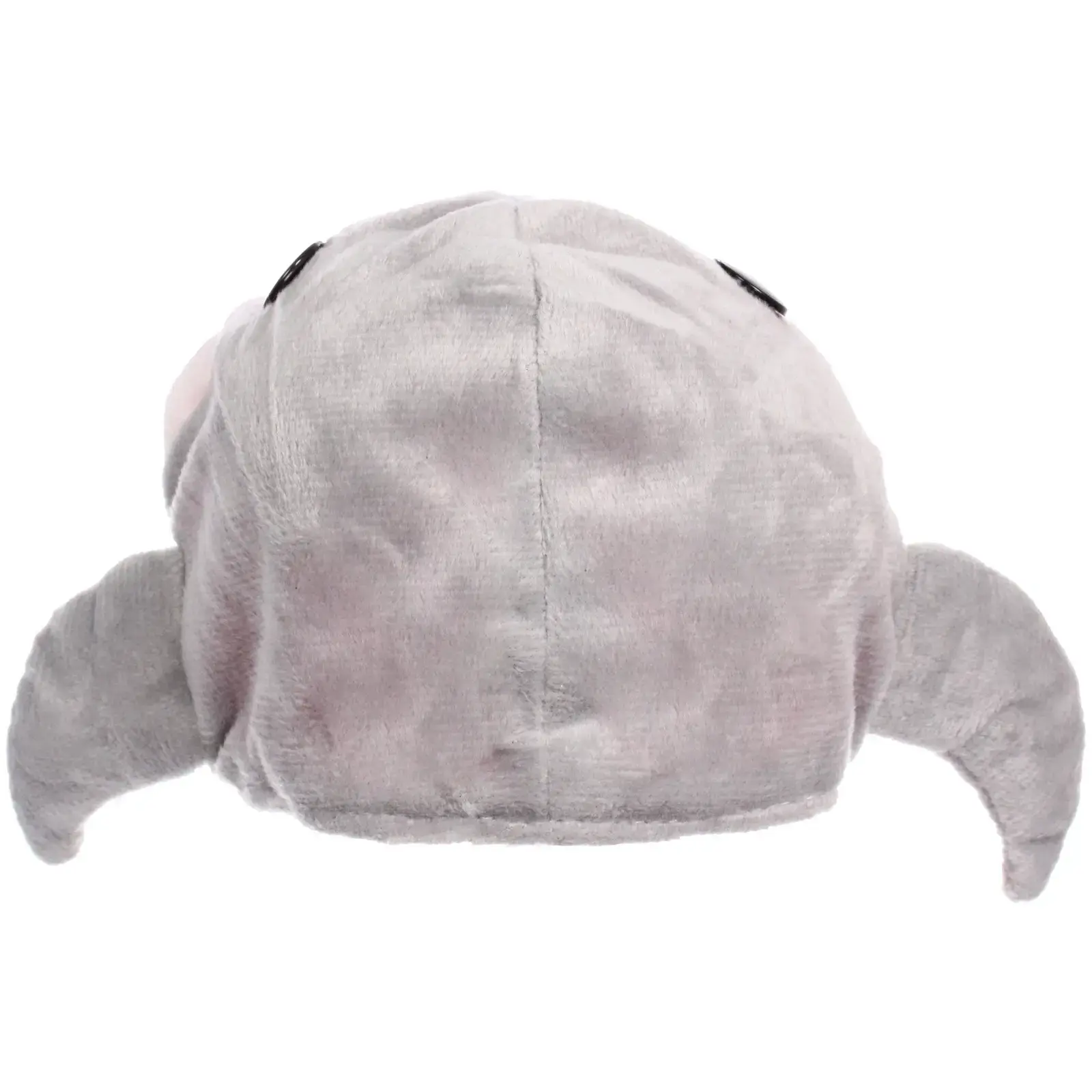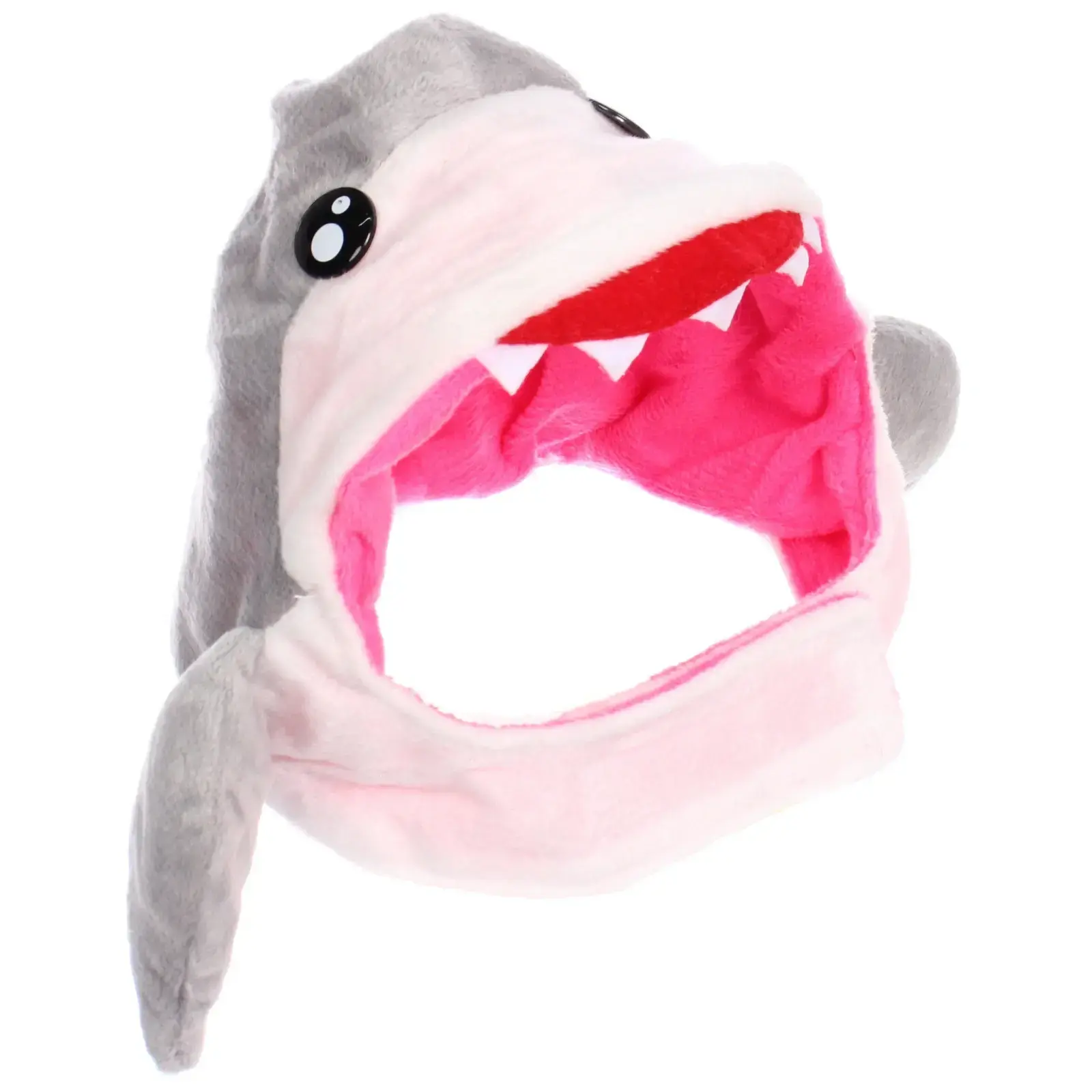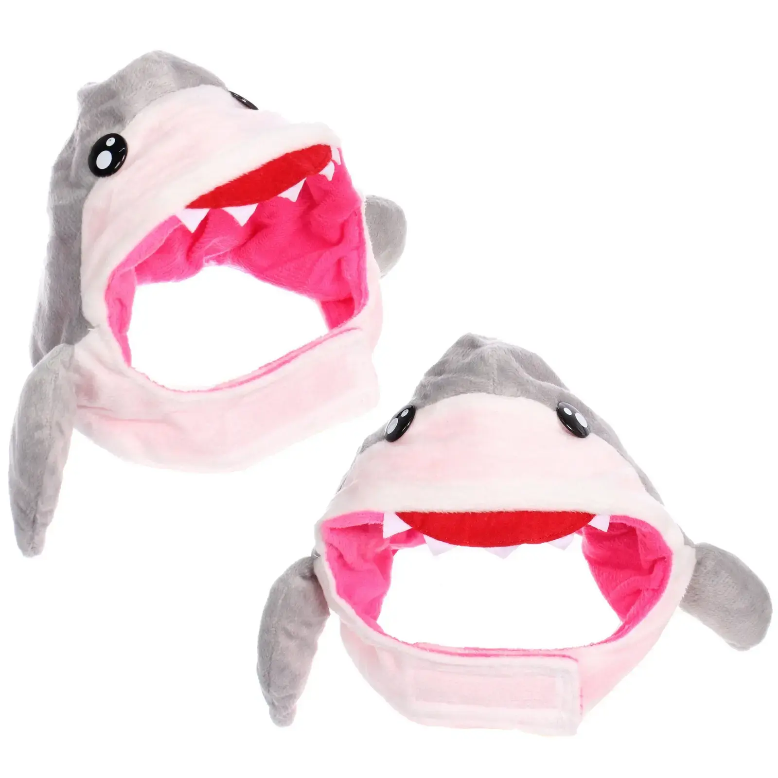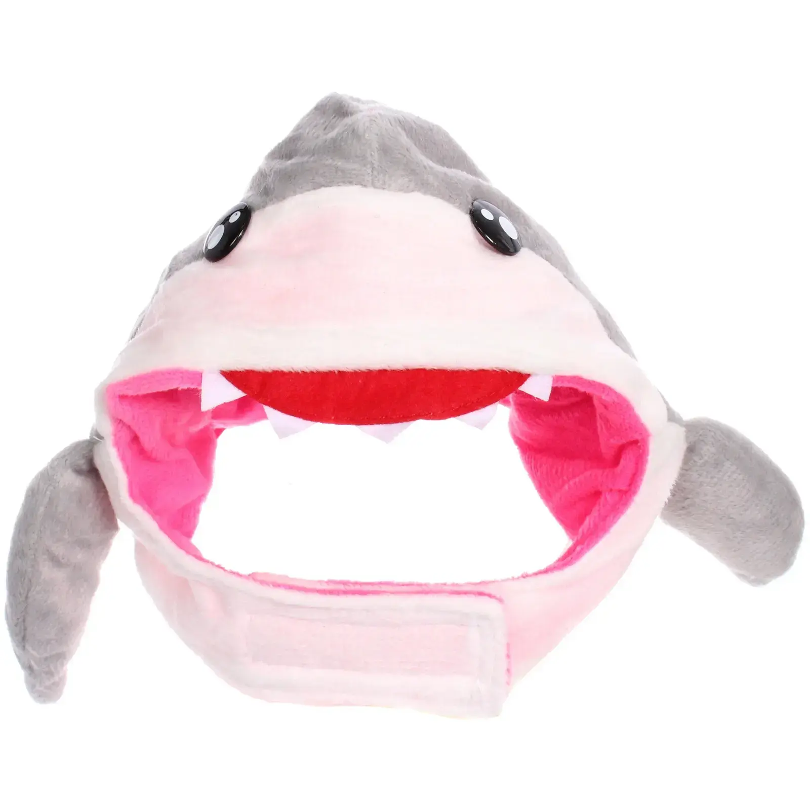 Шапка легко надевается и регулируется благодаря застежке на липучке, что позволяет подстроить ее под размер головы вашего питомца. Дизайн включает в себя яркие элементы: серый верх, розовую внутреннюю часть, а также забавные глазки и открытый рот с белыми зубами, что делает ее привлекательной для детей и взрослых.