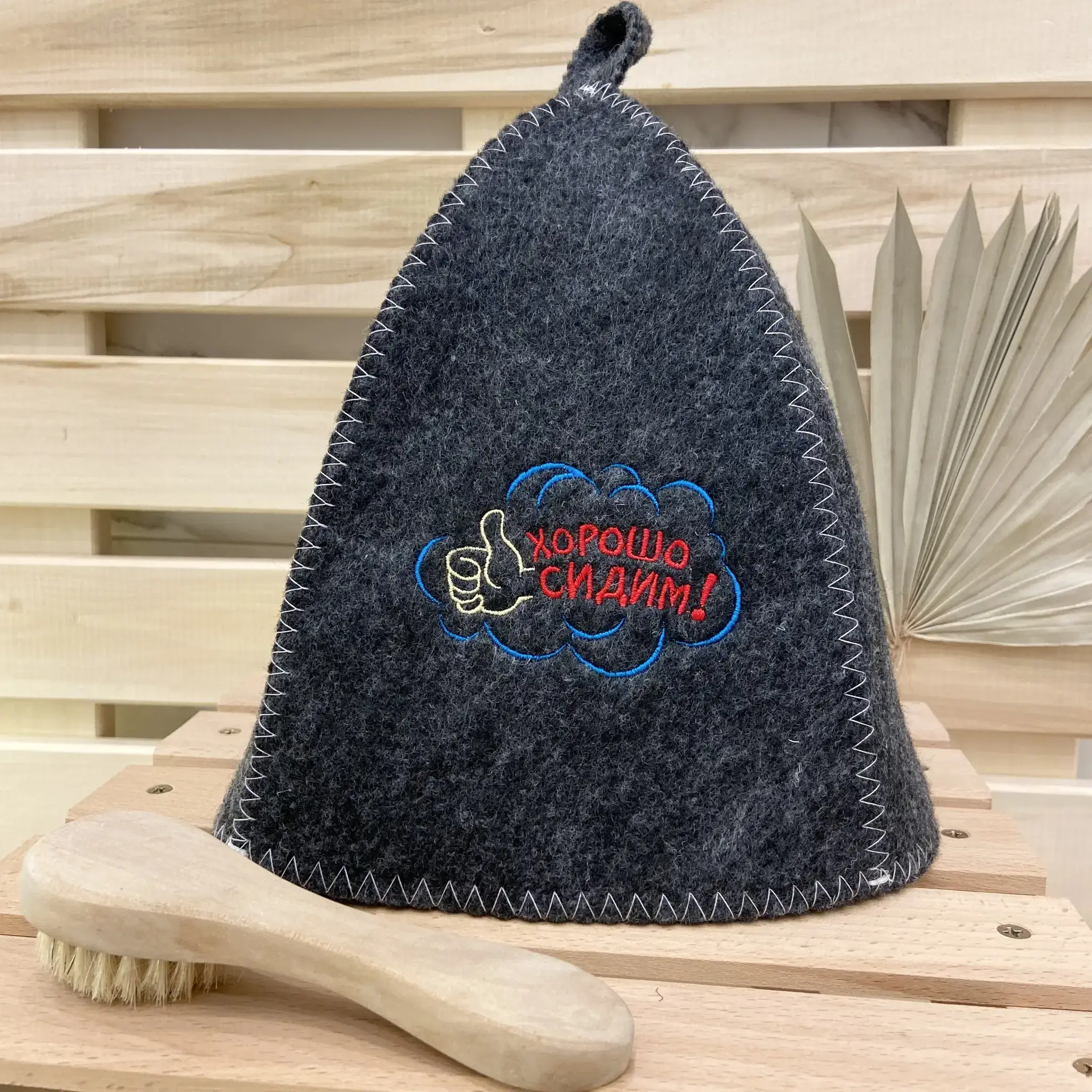 Шапка банная из войлока, серая с вышивкой «Хорошо сидим», конусовидная форма, петля для подвешивания