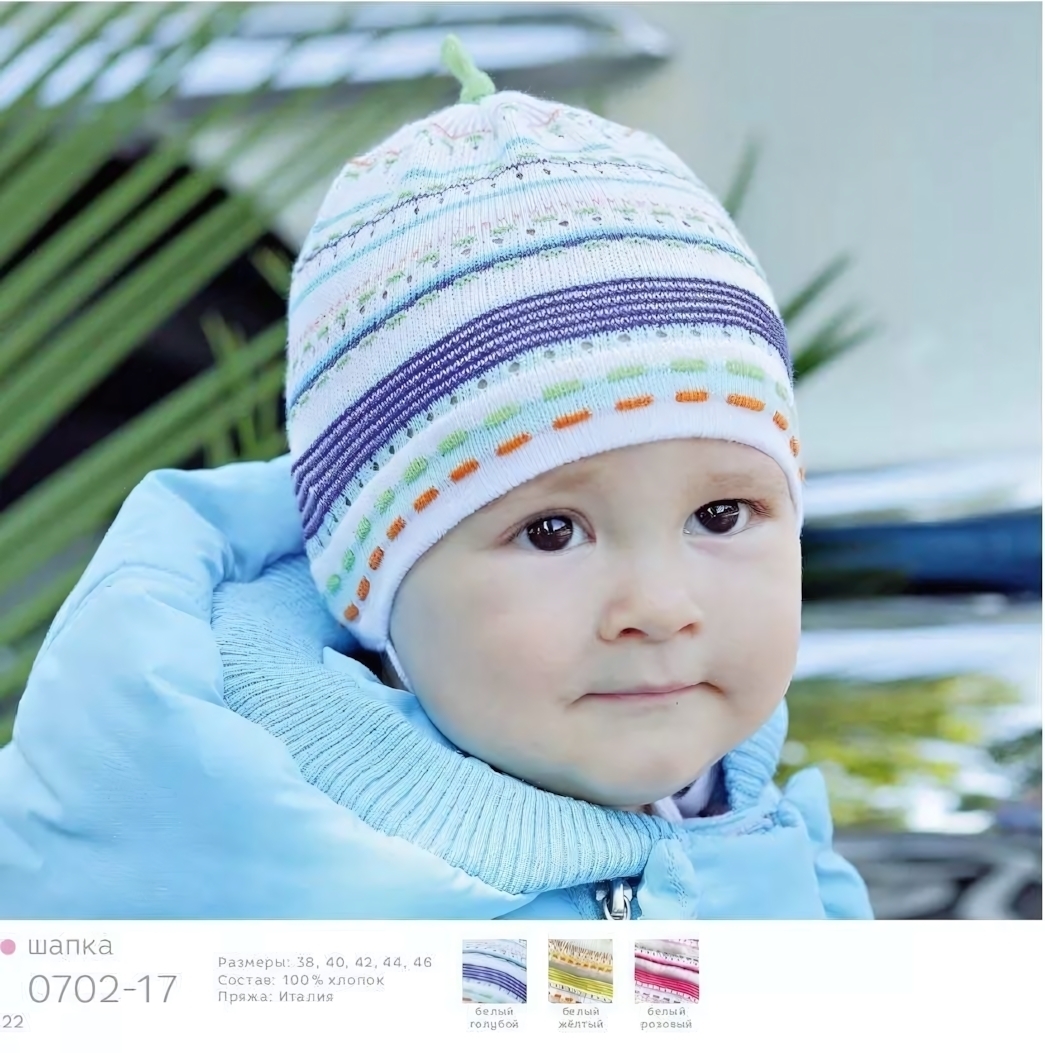 Шапка доступна в нескольких сочетаниях: белый с голубым, белый с жёлтым, белый с розовым. Отгружается один товар, цвет определяется случайным образом, что добавляет элемент приятного сюрприза.
