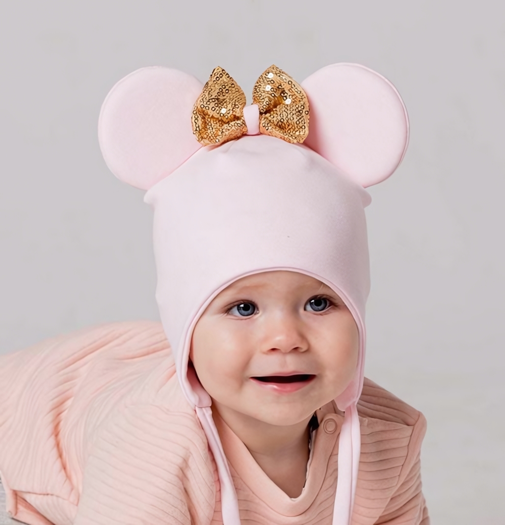 Шапка детская 'Мышка' с бантом из пайеток, размер 50-54, цвет пудра