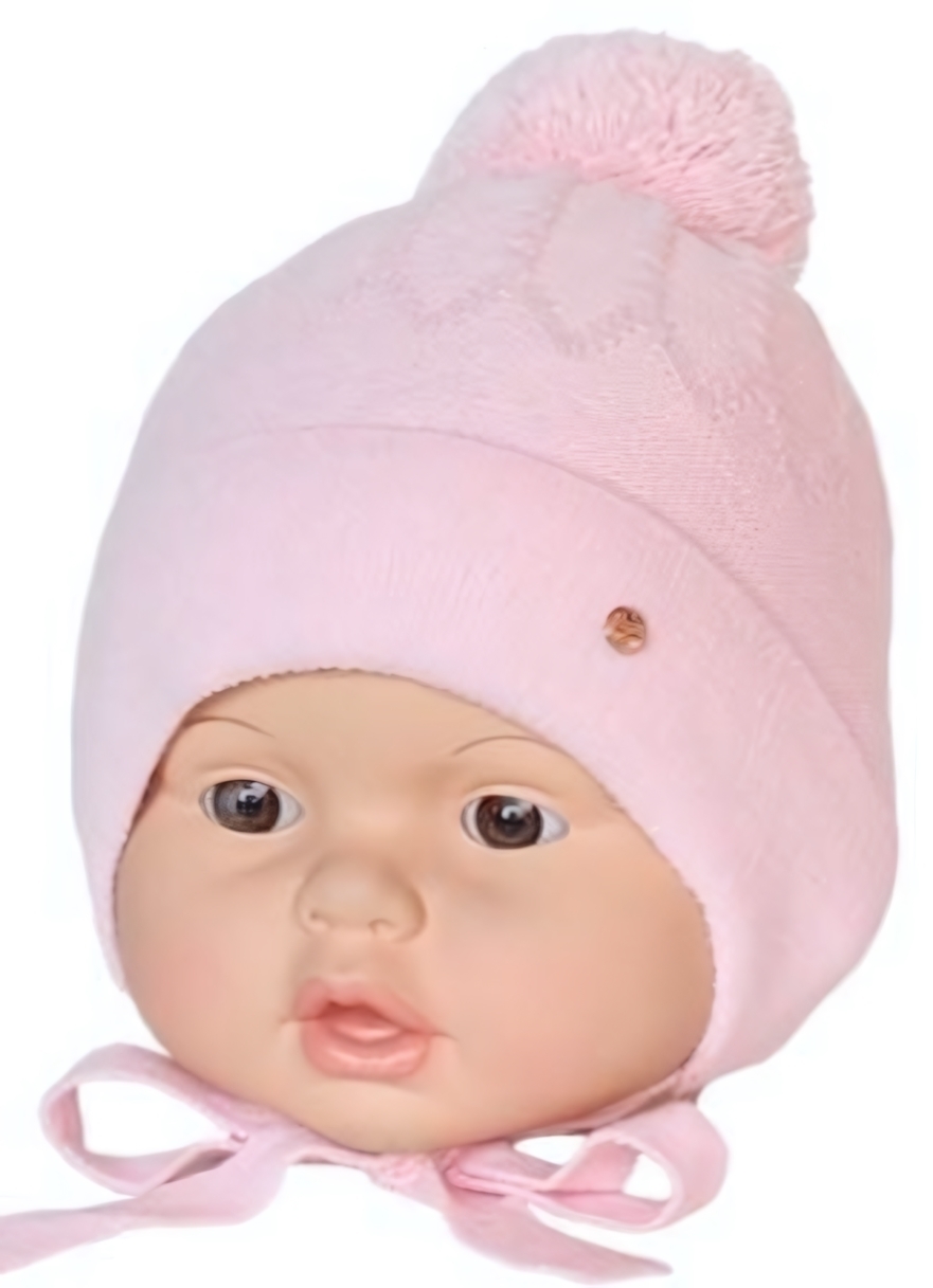 Нежный розовый цвет гармонирует с зимней одеждой в пастельных и ярких тонах. Благодаря компактным размерам (высота 18 см, окружность 52 см) шапка удобно помещается в сумке или коляске.