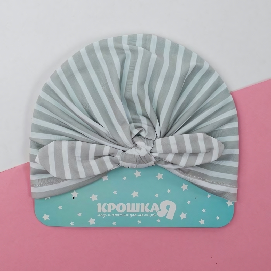 Размер 48 создаёт оптимальную посадку для маленьких детей. Шапочка сохраняет форму после стирок и легко надевается благодаря эластичному материалу. Цвет серо-белый в полоску гармонично сочетается с разнообразной одеждой, а дизайн с элементами бантовых складок добавляет очарования изделию.