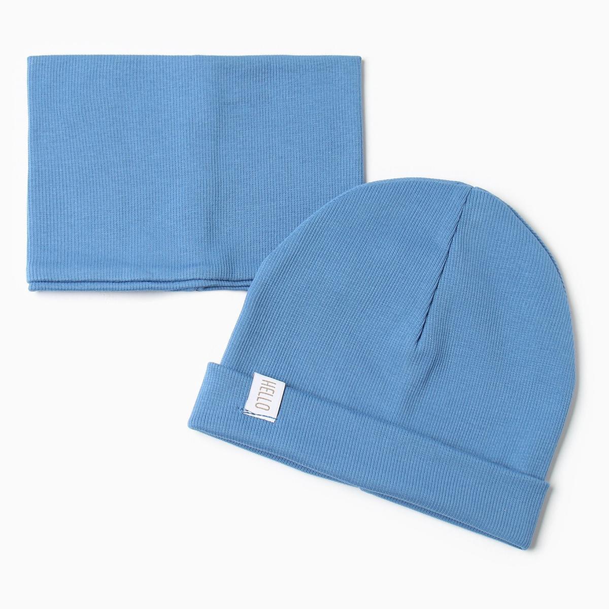 Шапка-бини и снуд детские "Крошка Я", размер 44, мягкий трикотаж, синий комплект с надписью "HELLO"