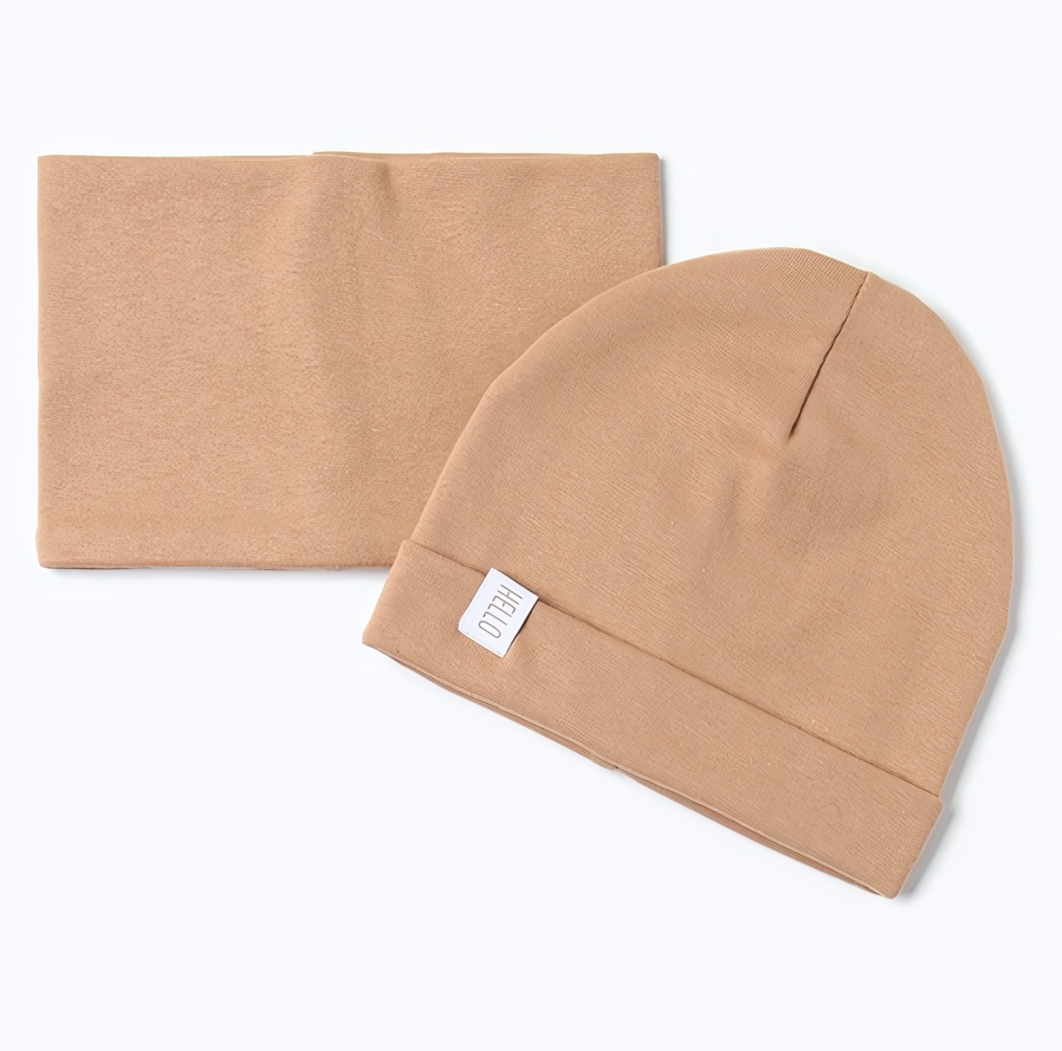 Эта шапочка со снудом станет отличным выбором для вашей девочки в прохладное время года. Мягкий трикотаж из хлопка с небольшим добавлением эластана гарантирует комфорт и приятные ощущения при носке, а светло-бежевый цвет легко сочетать с любой верхней одеждой. Комплект обеспечивает двойную защиту — шапка удерживает тепло головы, а удобный снуд защищает шею от ветра.