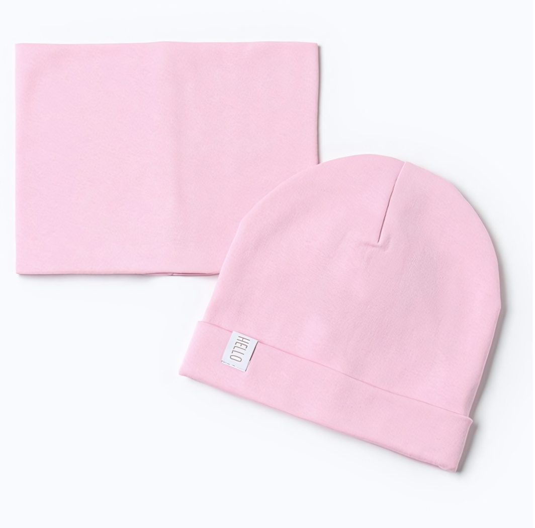 Шапка имеет округлую форму с отворотом, который можно регулировать под рост головы, а также закрепленный белый ярлык с надписью «HELLO», добавляющий изделию стильный акцент. Благодаря легкому и дышащему материалу, она позволяет коже дышать и препятствует перегреву. Поверхности предметов мягкие и гладкие, что обеспечивает комфорт даже чувствительной коже.