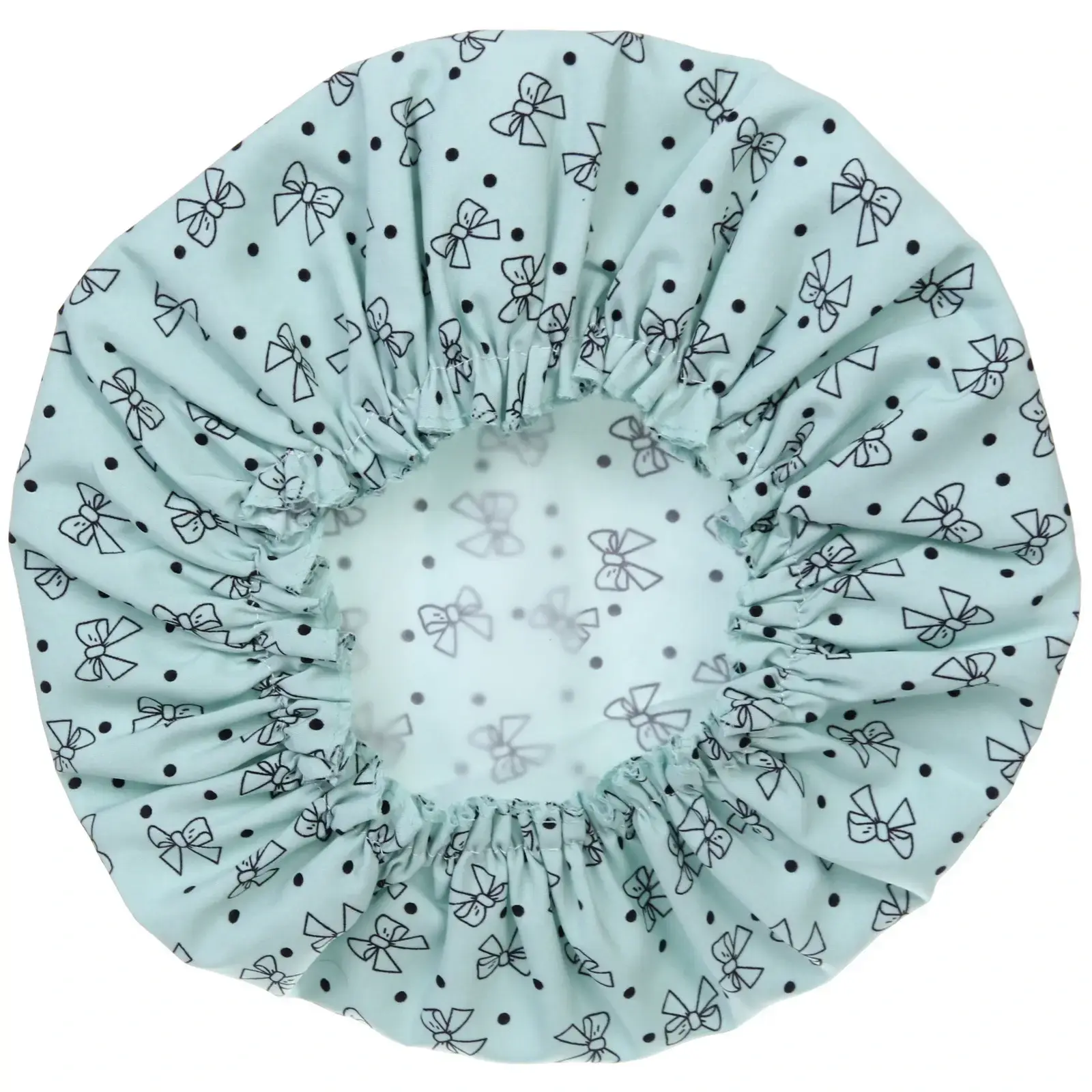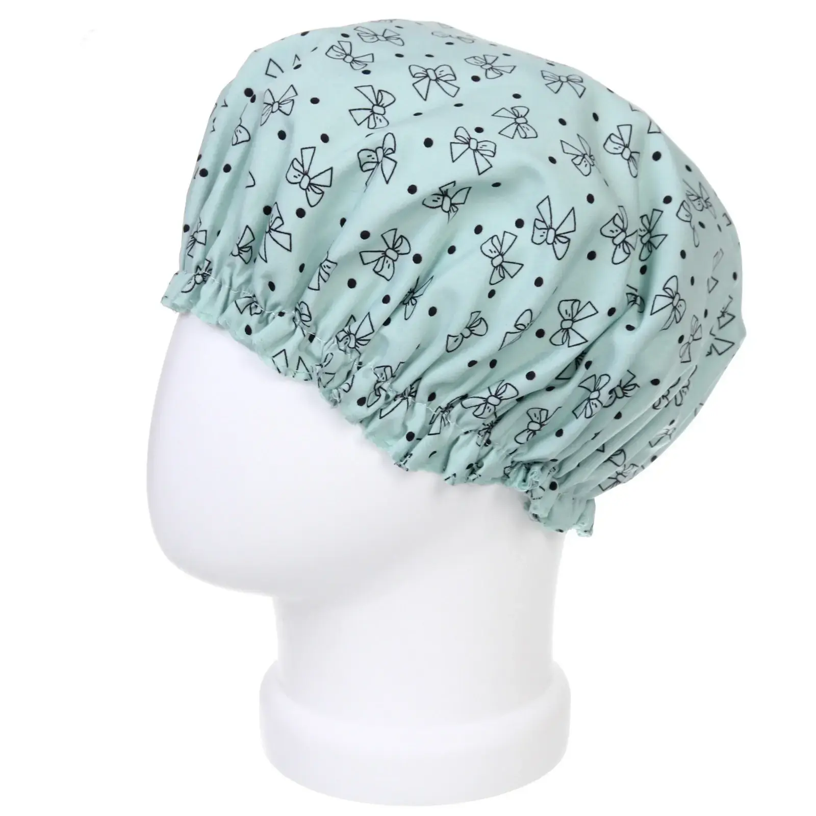 Благодаря стильному дизайну с черными бантиками и точками, шапочка не только функциональна, но и эстетична. Мятный цвет добавляет свежести вашей ванной комнате.