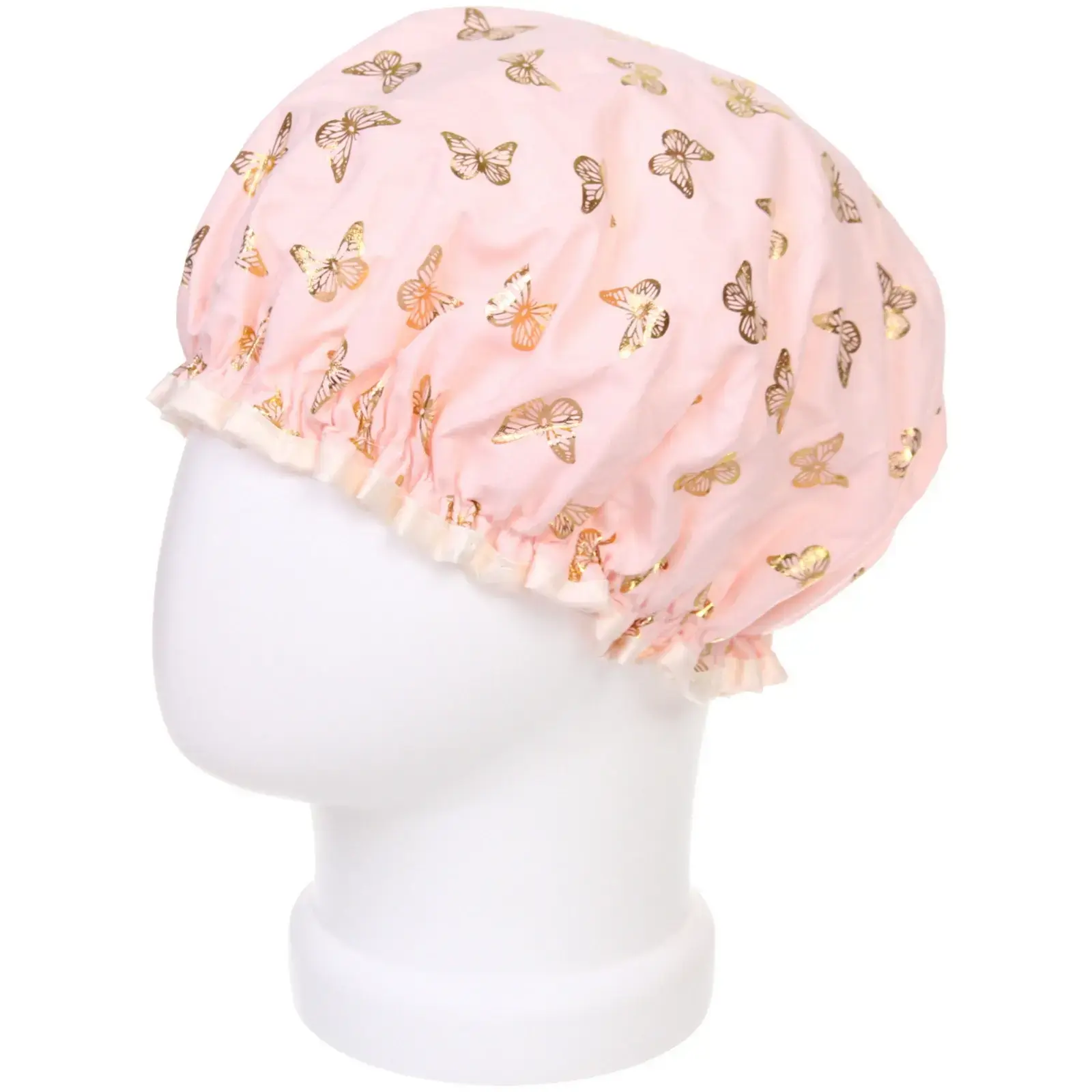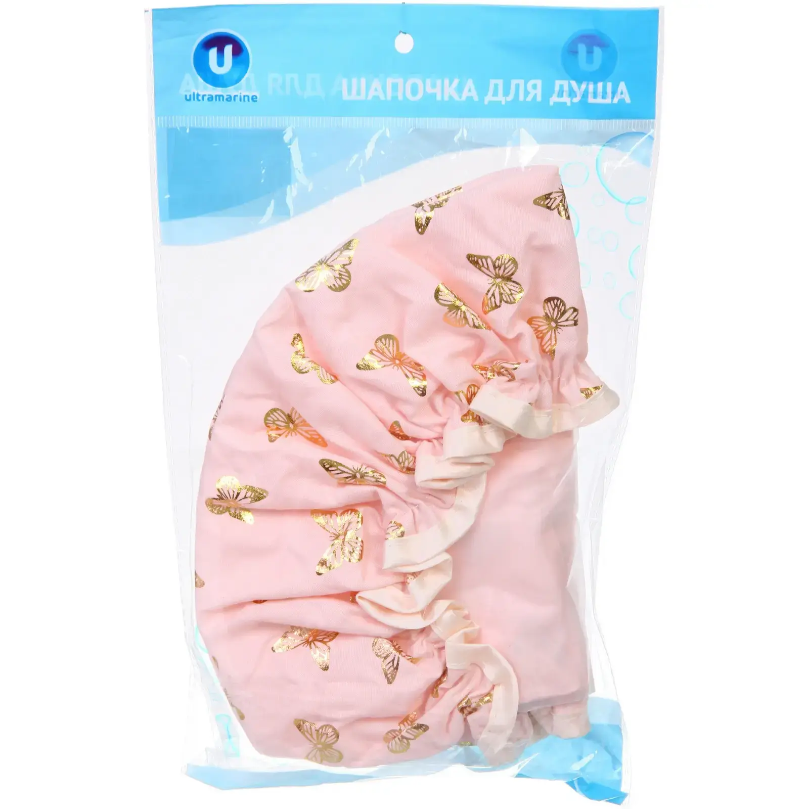 Шапочка выполнена из высококачественного материала с водоотталкивающими свойствами. Ее эластичная резинка обеспечивает комфортное прилегание, не вызывая дискомфорта. Декоративный узор с золотыми бабочками добавляет стильный акцент, делая аксессуар не только функциональным, но и красивым.