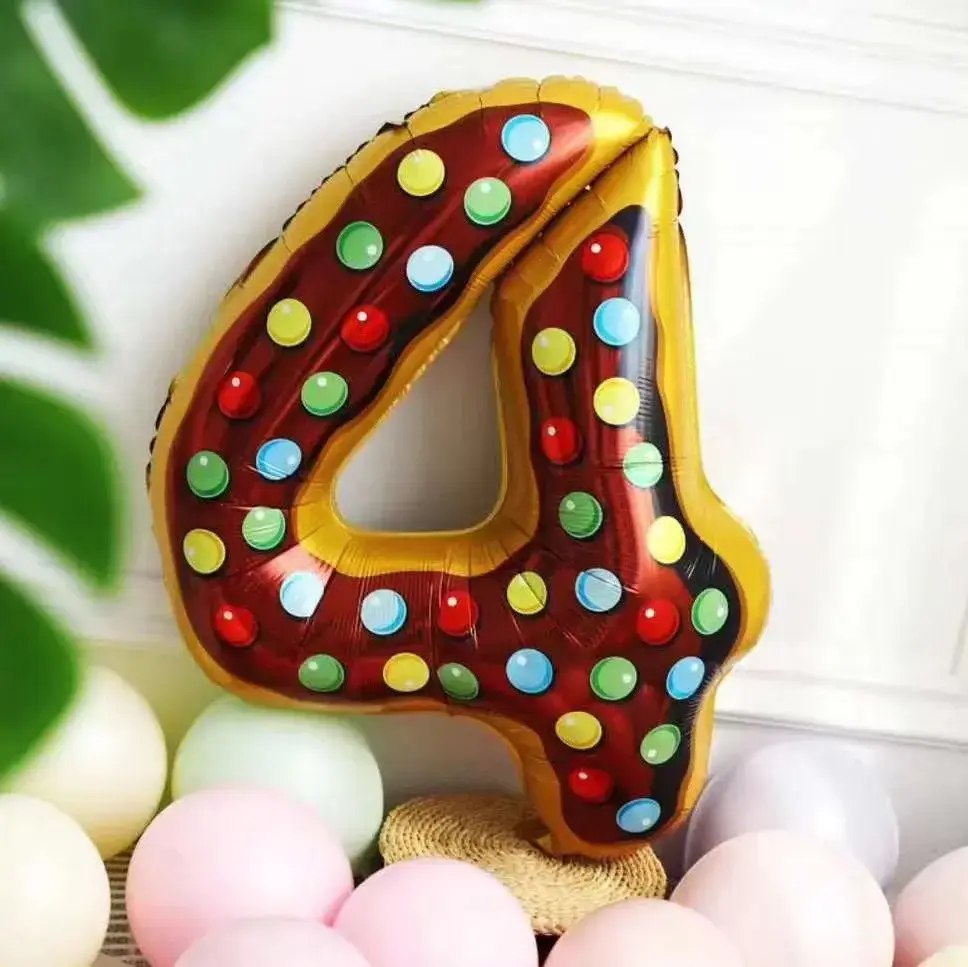 Шар имеет размеры 32 дюйма (81 см) и выполнен в коричневом цвете с узором, имитирующим глазурь. Разноцветные круглые элементы на поверхности шара напоминают сладости, что делает его особенно привлекательным для детей. Упаковка шара оформлена в ярком дизайне, что также добавляет ему привлекательности.
