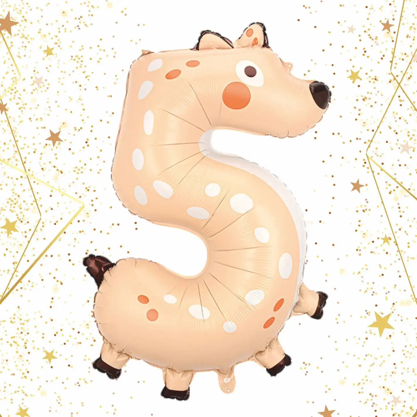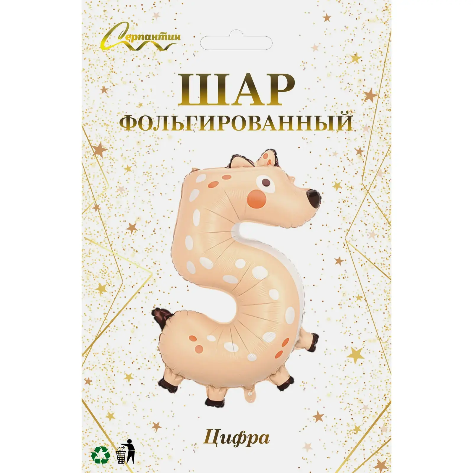 Шар фольгированный 100см Цифра 5 'Весёлый зоопарк', бежевый/белый