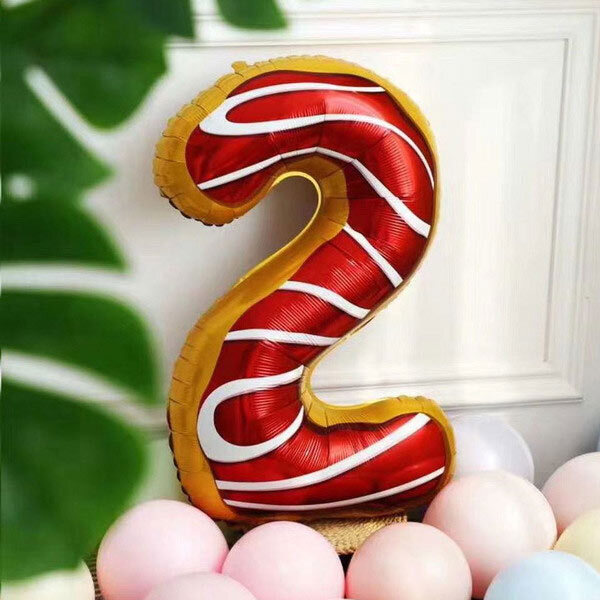 Фольгированный шар в форме цифры 2 — это идеальный способ добавить яркие акценты в любое торжество. Его высота составляет 81 см, что делает его заметным элементом декора. Яркий красный цвет с белыми и золотыми полосами, имитирующими сладкое угощение, создаёт праздничное настроение и привлекает внимание гостей.
