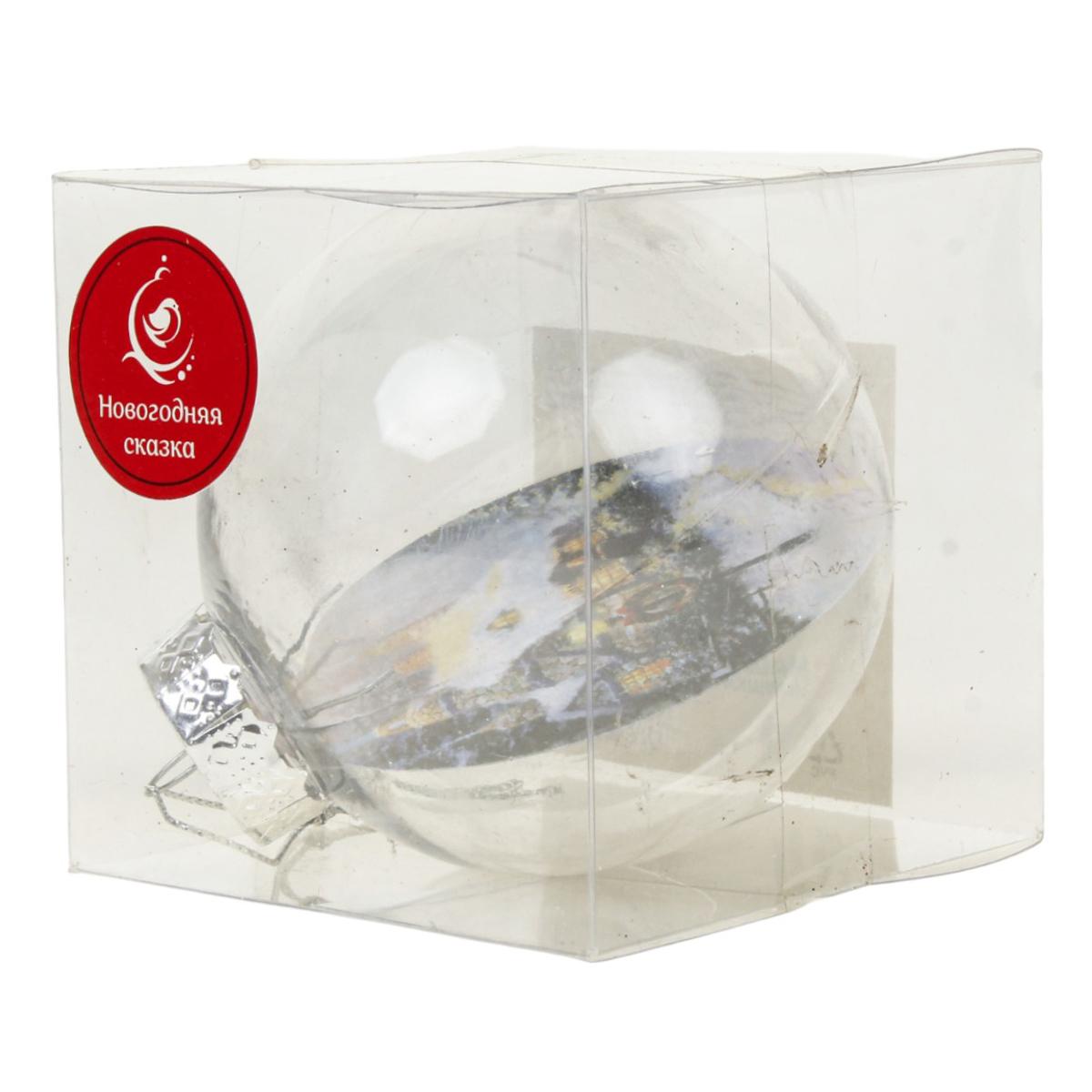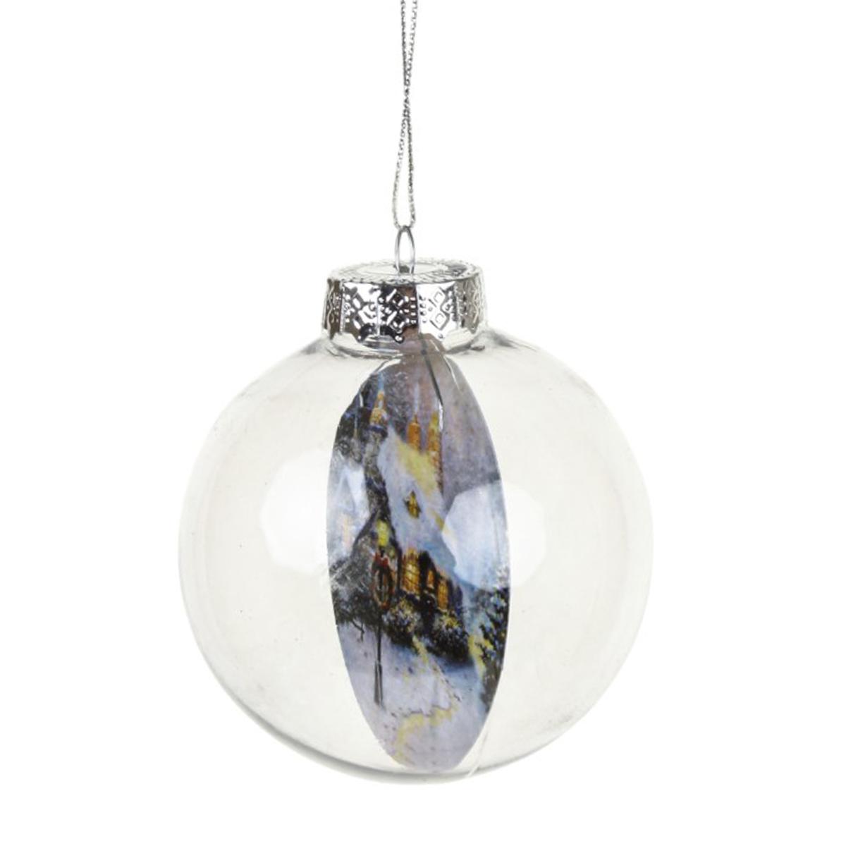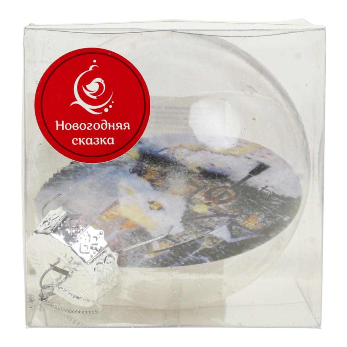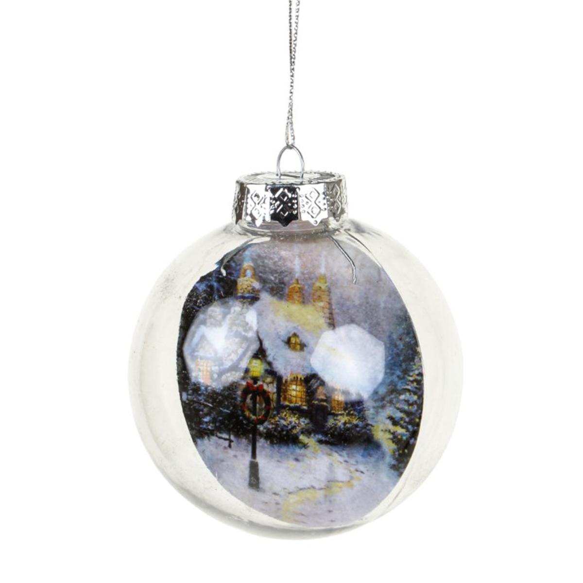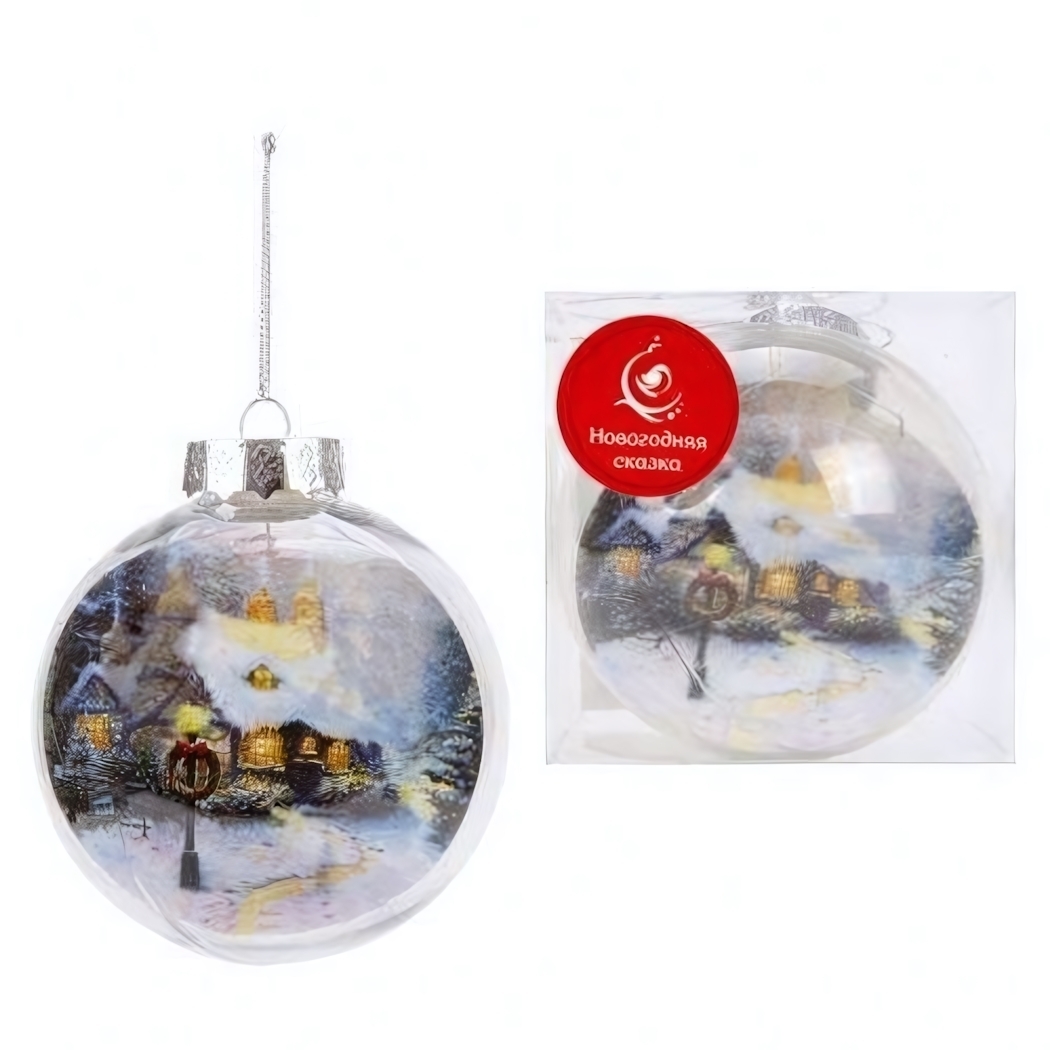 Диаметр шара — 8 см, материал — высококачественное стекло, внутренняя часть оформлена художественной вставкой, имитирующей зимний деревенский пейзаж со светящимся венком. Крышка выполнена из прочного серебристого металла, а петля‑цепочка обеспечивает безопасное и удобное крепление.