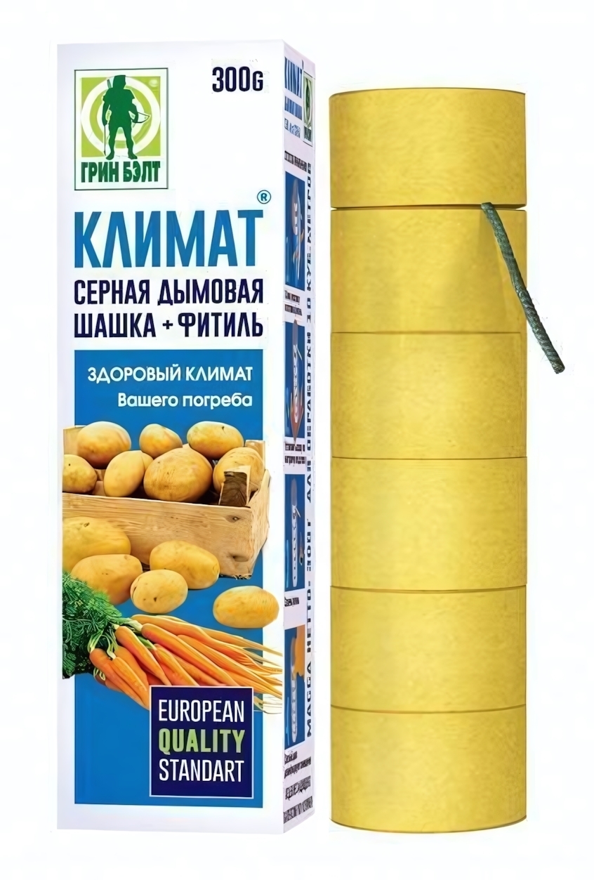 Серная дымовая шашка «климат» серии green belt весом 300 г обеспечивает мгновенную дезинфекцию, уничтожая мучные червецы, плесень и запахи, создавая здоровый микроклимат в подвале, в теплице и на огороде.