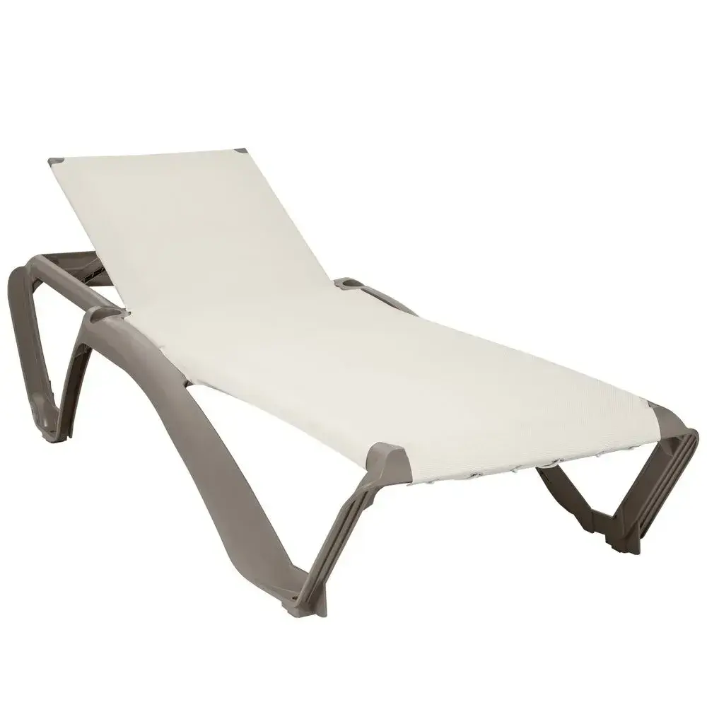 Шезлонг сочетает практичность и стильный дизайн. Прочная ткань цвета слоновой кости устойчива к выгоранию, а надежный каркас цвета мокко изготовлен из качественного пластика, который не боится перепадов температур.