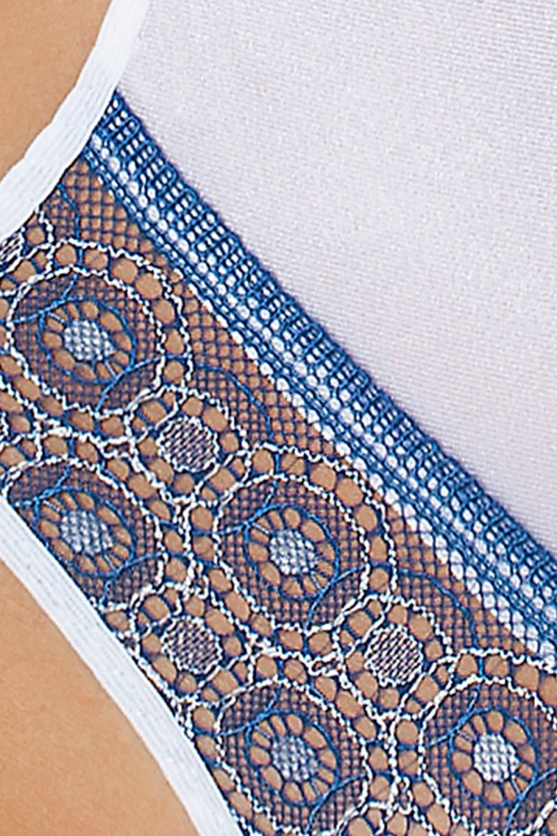 - Кружевные вставки: Нижняя часть украшена ажурным синим кружевом с геометрическим узором, создающим эффектный контраст с гладкой белой тканью.