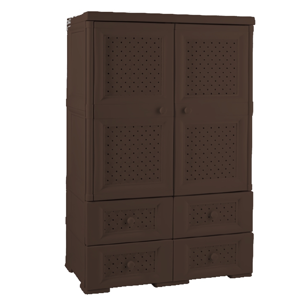 Шкаф выполнен из качественного пластика, что делает его легким и удобным в использовании. Гладкие поверхности легко очищаются от загрязнений, а перфорация на дверках добавляет оригинальности и стиля. Этот шкаф-комод прослужит вам долго, сохраняя свой первоначальный вид и функциональность.