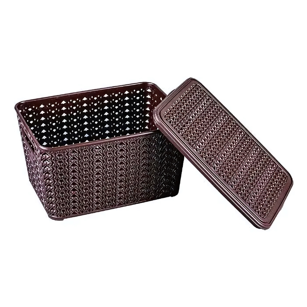 Эргономичная прямоугольная форма обеспечивает компактное размещение на полках. Гладкая внутренняя поверхность предотвращает зацепление нитей. Удобные боковые ручки для переноски и доступа к содержимому.