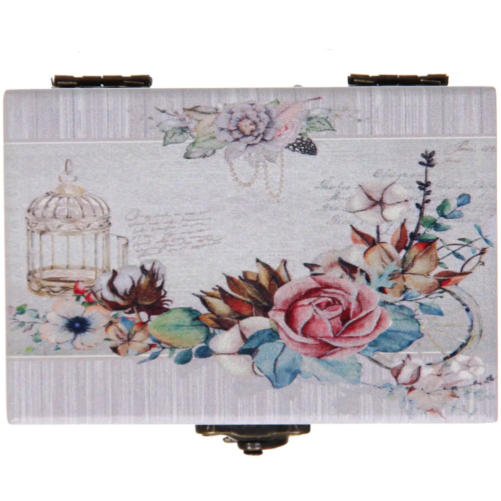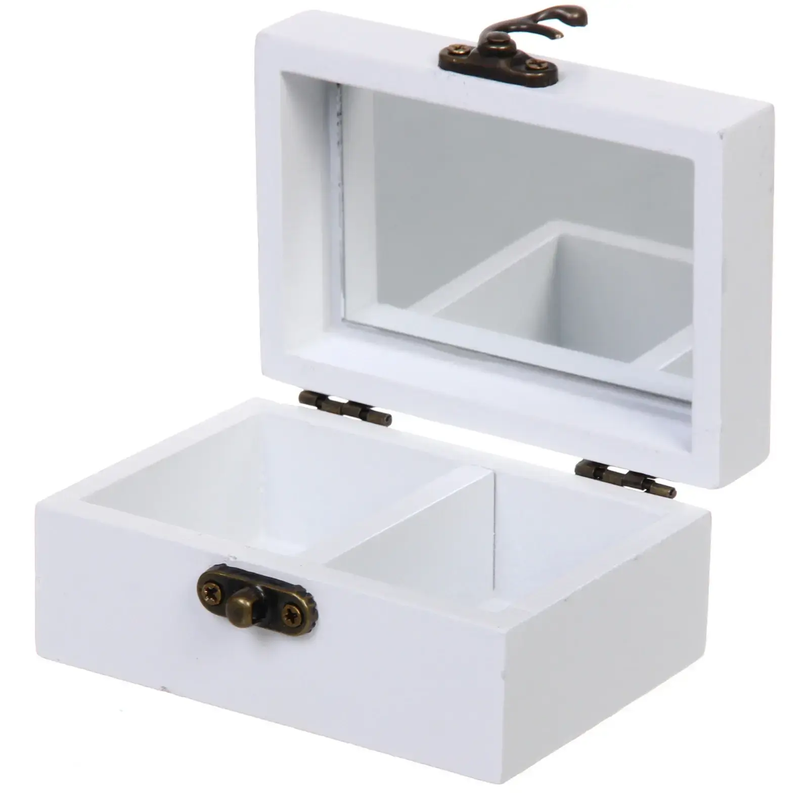 Шкатулка выполнена из качественного дерева, что обеспечивает её долговечность и надежность. Металлический замок бронзового цвета добавляет изысканности и защищает содержимое от случайного выпадения. Внутри шкатулки находится зеркало, что делает её ещё более практичной для использования.