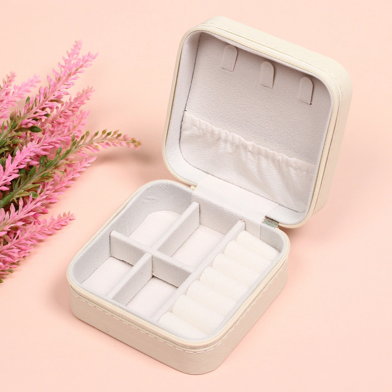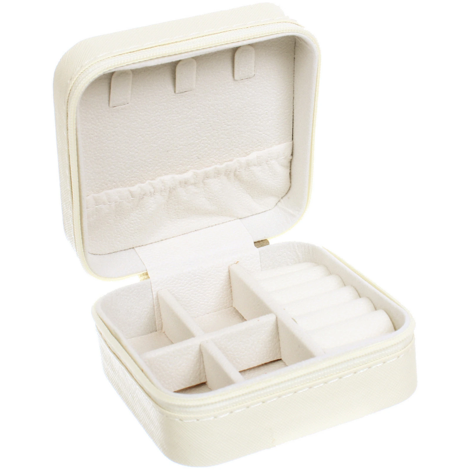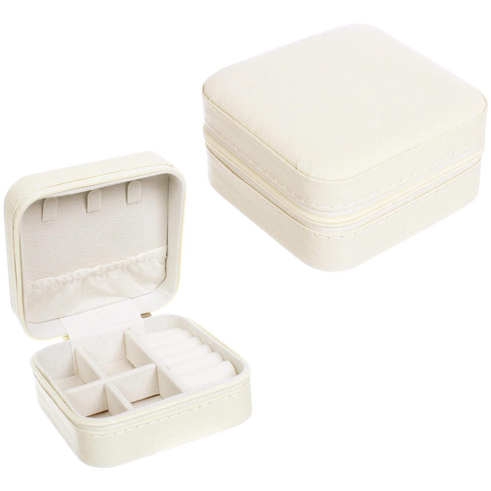 Шкатулка изготовлена из прочных и практичных материалов. Внешний корпус из ПВХ и пластика устойчив к внешним воздействиям, его легко протирать от пыли. Светлый оттенок слоновой кости выглядит нежно и элегантно, гармонично вписываясь в интерьер спальни, гардеробной или ванной комнаты. Надёжная застёжка-молния по всему периметру обеспечивает полную защиту содержимого от пыли, влаги и случайного выпадения. Компактные размеры 10х10х5 см позволяют удобно хранить шкатулку на туалетном столике, в ящике комода или брать с собой в поездку.