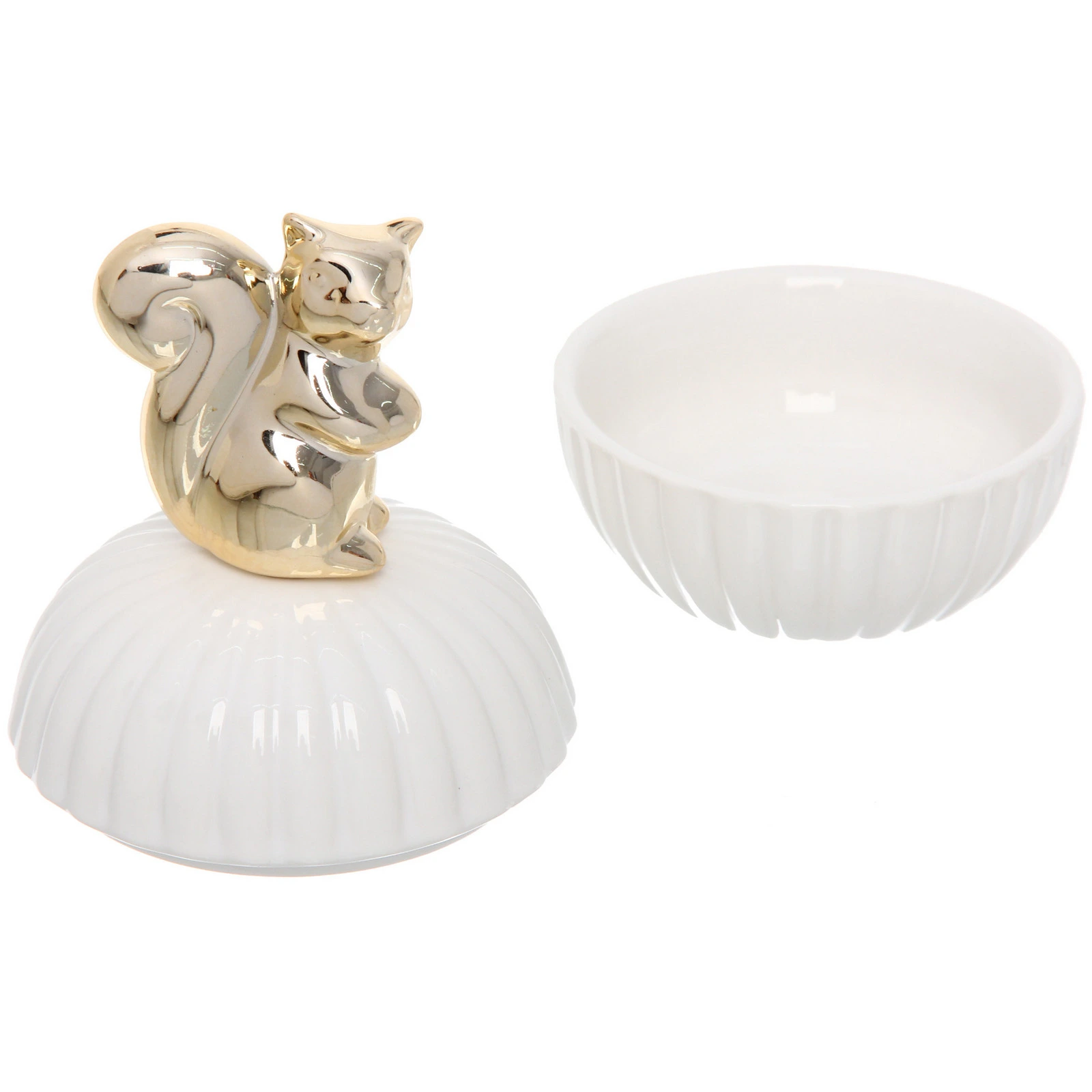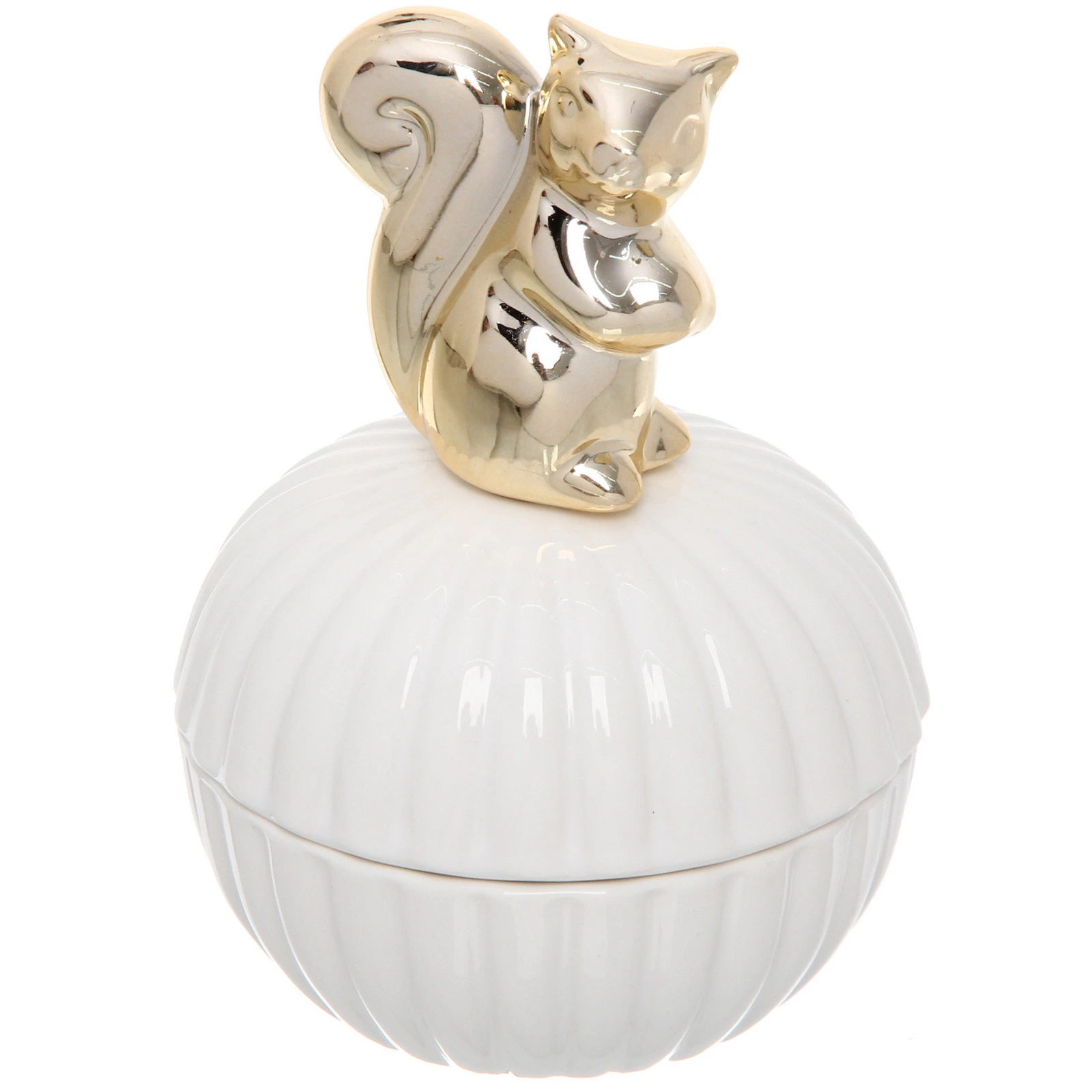 - Эстетичный дизайн: Сочетание белоснежной глянцевой керамики и золотистой фигурки белки создаёт утончённый акцент в любом помещении.