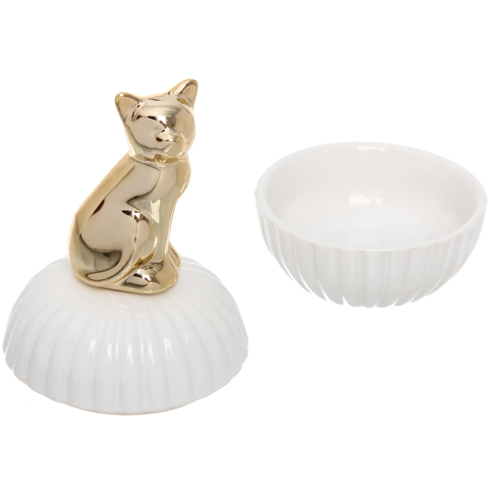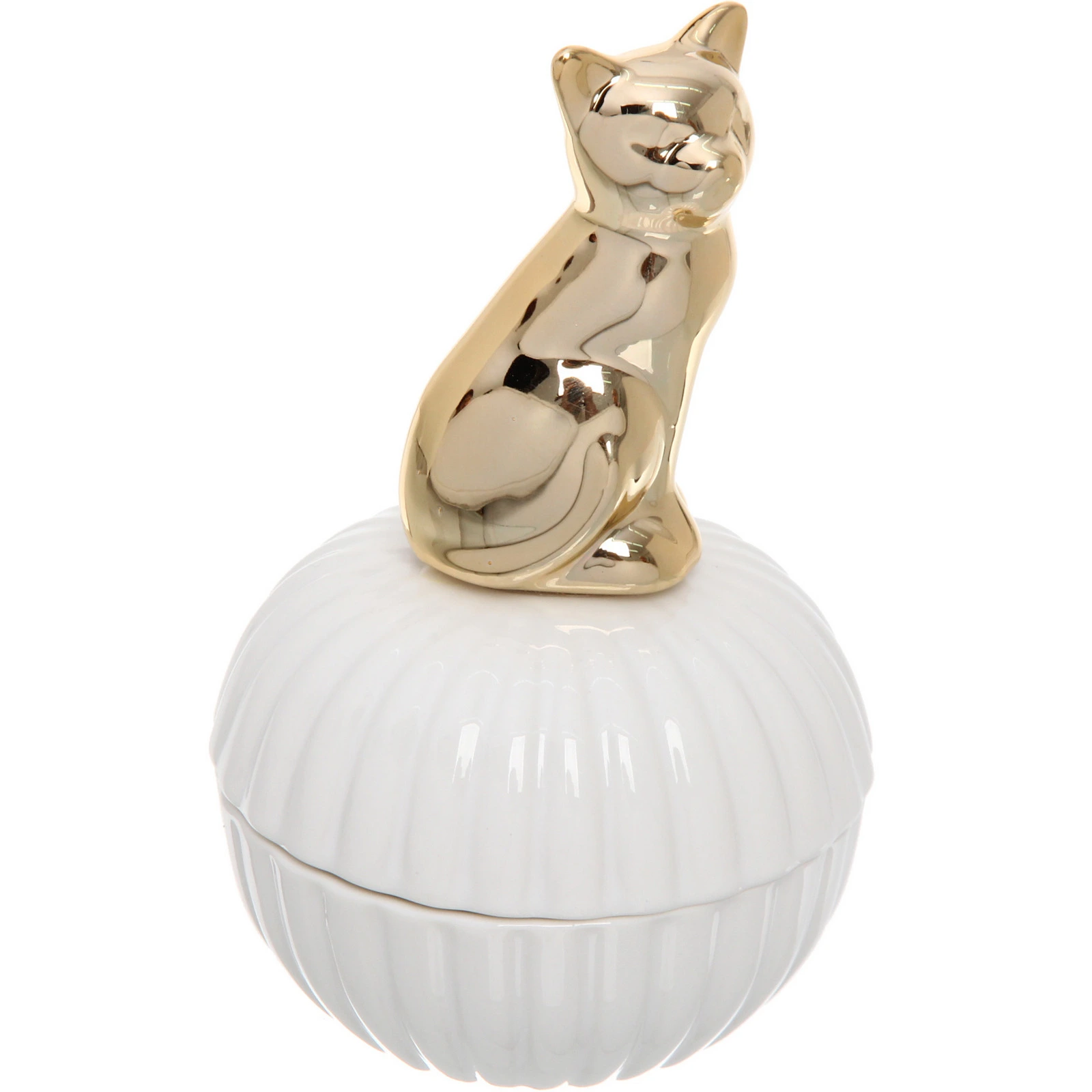Шкатулка выполнена из качественной керамики с глянцевой белой поверхностью, украшенной изящным вертикальным рельефом. На крышке размещена объемная фигурка сидящей кошки, покрытая глянцевым золотистым покрытием. Такое сочетание создает эффектный контраст и добавляет изделию утонченности.