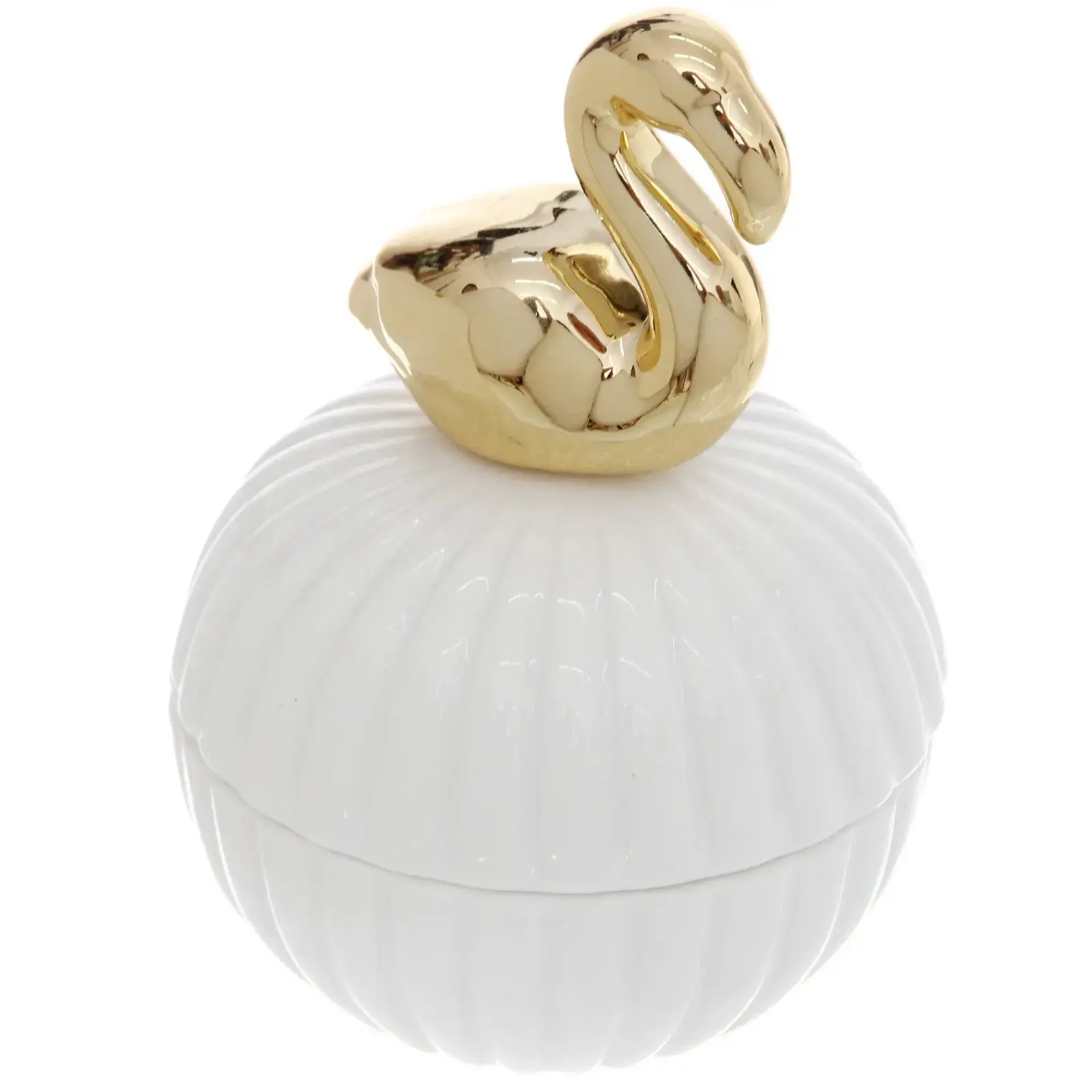 Выбирая шкатулку «GOLD Podarok», вы получаете не только качественный продукт, но и стильный элемент декора. Керамика обеспечивает долговечность и надежность, а рифленая поверхность добавляет текстуры и интереса к дизайну. Золотистая крышка в форме лебедя придаёт изделию уникальность и элегантность.
