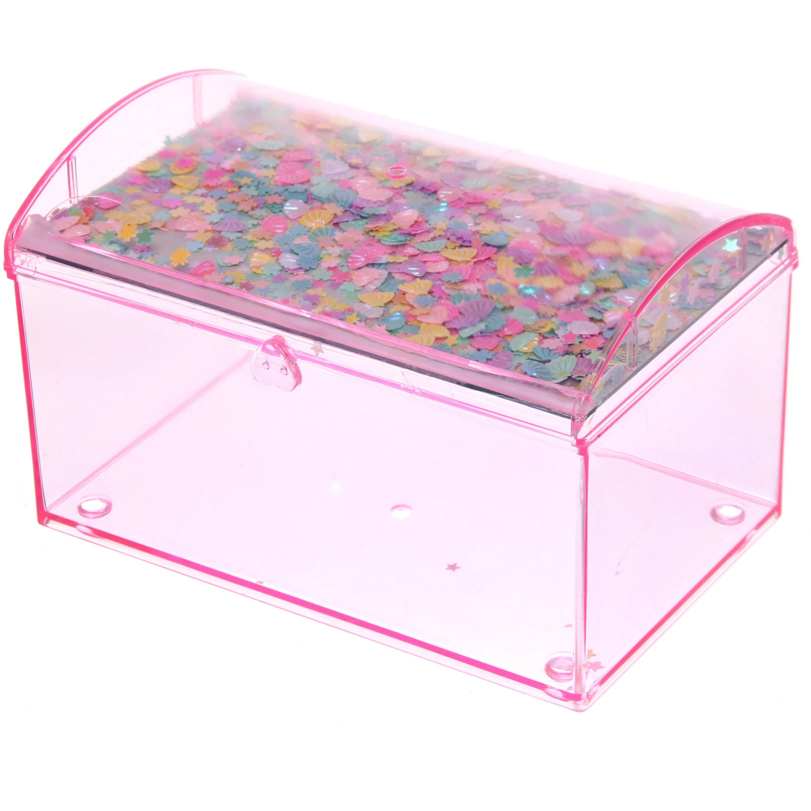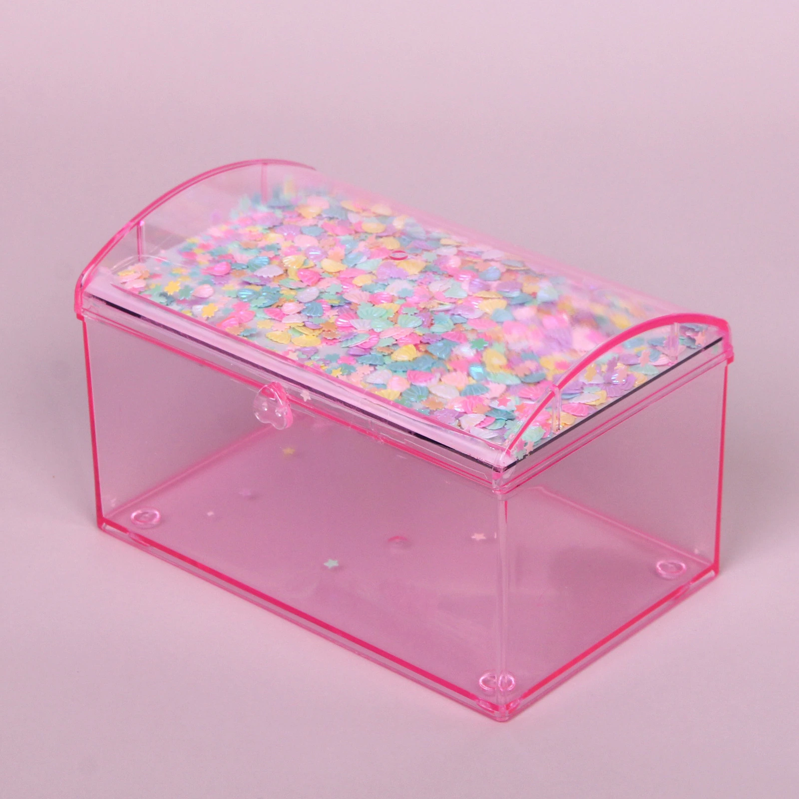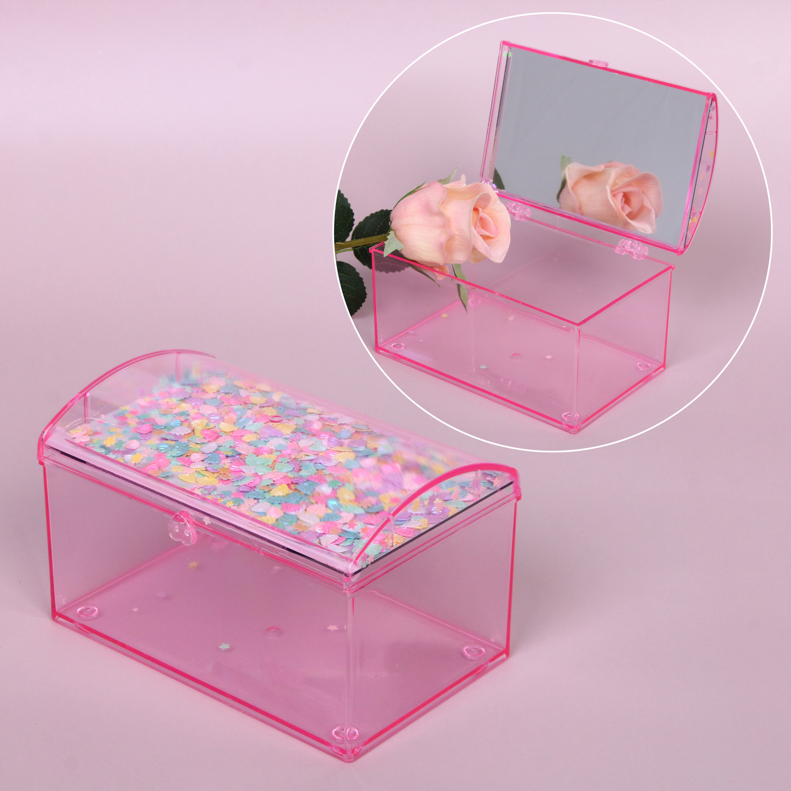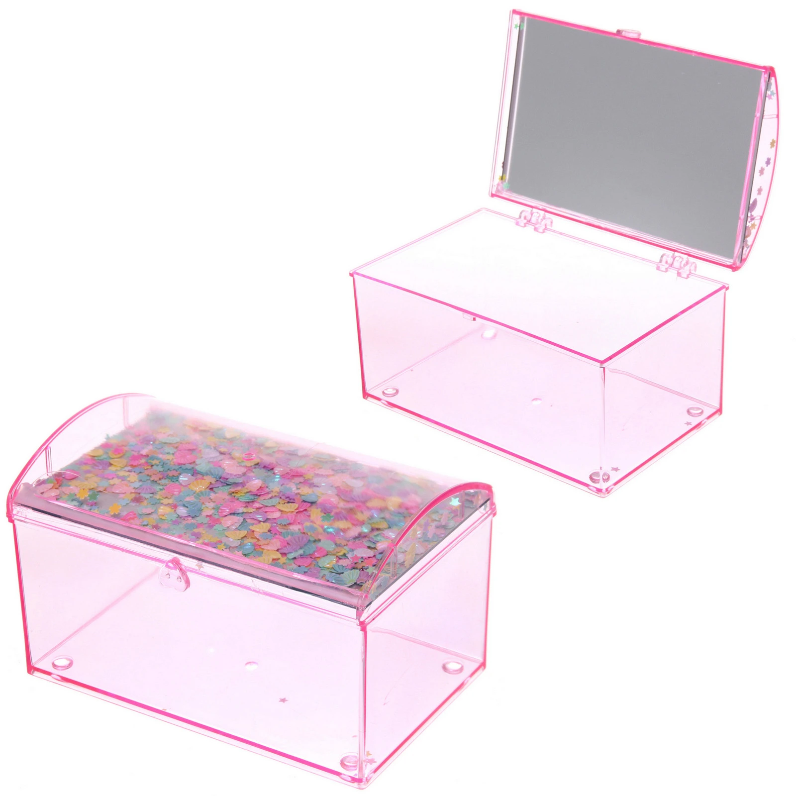 Шкатулка изготовлена из пластика и стекла (зеркало). Её прямоугольная форма с закруглённой крышкой и небольшими ножками по углам обеспечивает устойчивость на любой поверхности. Яркие декоративные элементы под прозрачной крышкой (разноцветные конфетти в форме ракушек и звёздочек) добавляют изделию игривости и индивидуальности.