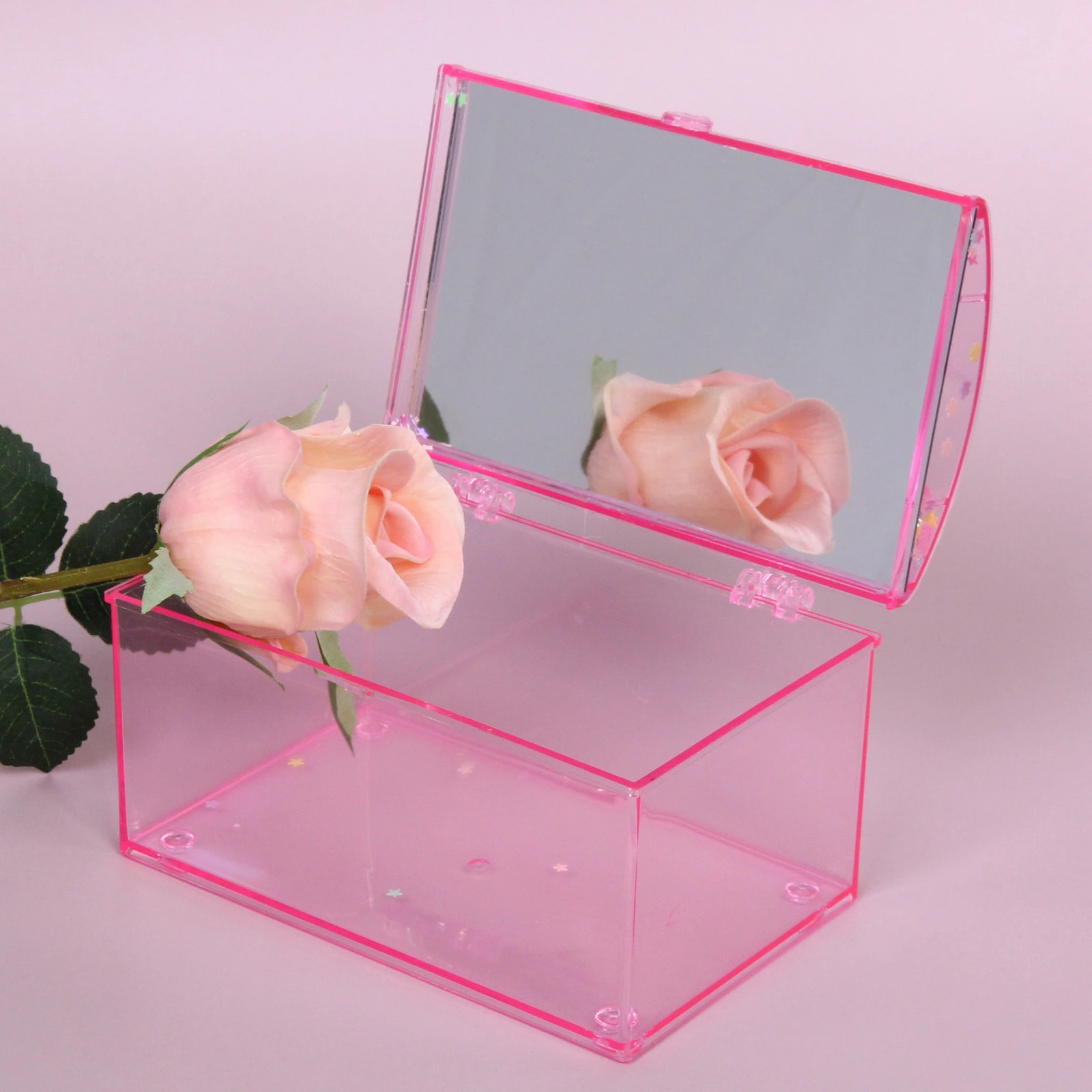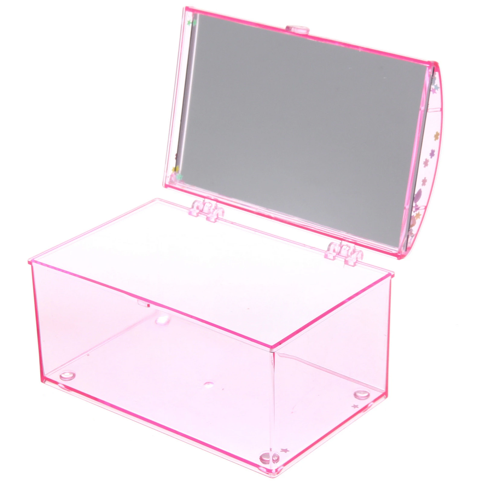 Эта изящная пластиковая шкатулка сочетает в себе практичность и очаровательный дизайн. Она станет не только удобным местом для хранения мелких предметов, но и стильным аксессуаром на вашем туалетном столике или рабочем столе. Внутренняя сторона крышки выполнена в виде зеркала, что делает её особенно удобной для ежедневного использования.