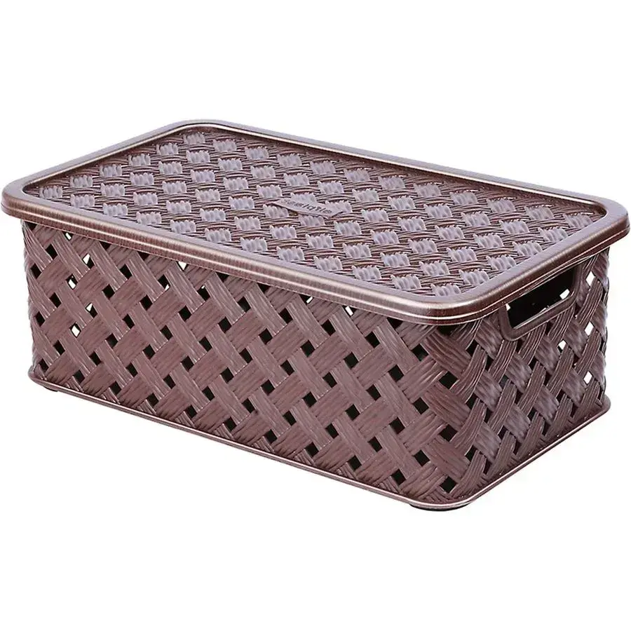 Прямоугольная форма с плоской крышкой обеспечивает компактное размещение на полках или под столом. Материал корпуса устойчив к влаге и прост в уходе — достаточно протереть влажной салфеткой. Декоративное плетение придает шкатулке вид ротанговой корзины, сохраняя преимущества пластика: легкость и долговечность.