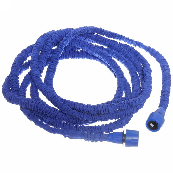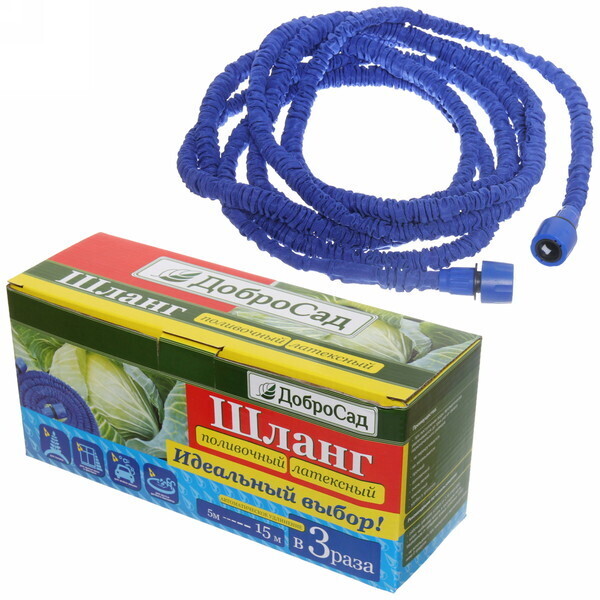 Шланг имеет ярко-синий цвет и текстурированную поверхность, что придает ему стильный вид. Он легко сворачивается и хранится, а также не запутывается во время использования. Размеры шланга в развернутом состоянии составляют 15 метров, а в сложенном — всего 5 метров, что делает его удобным для транспортировки.