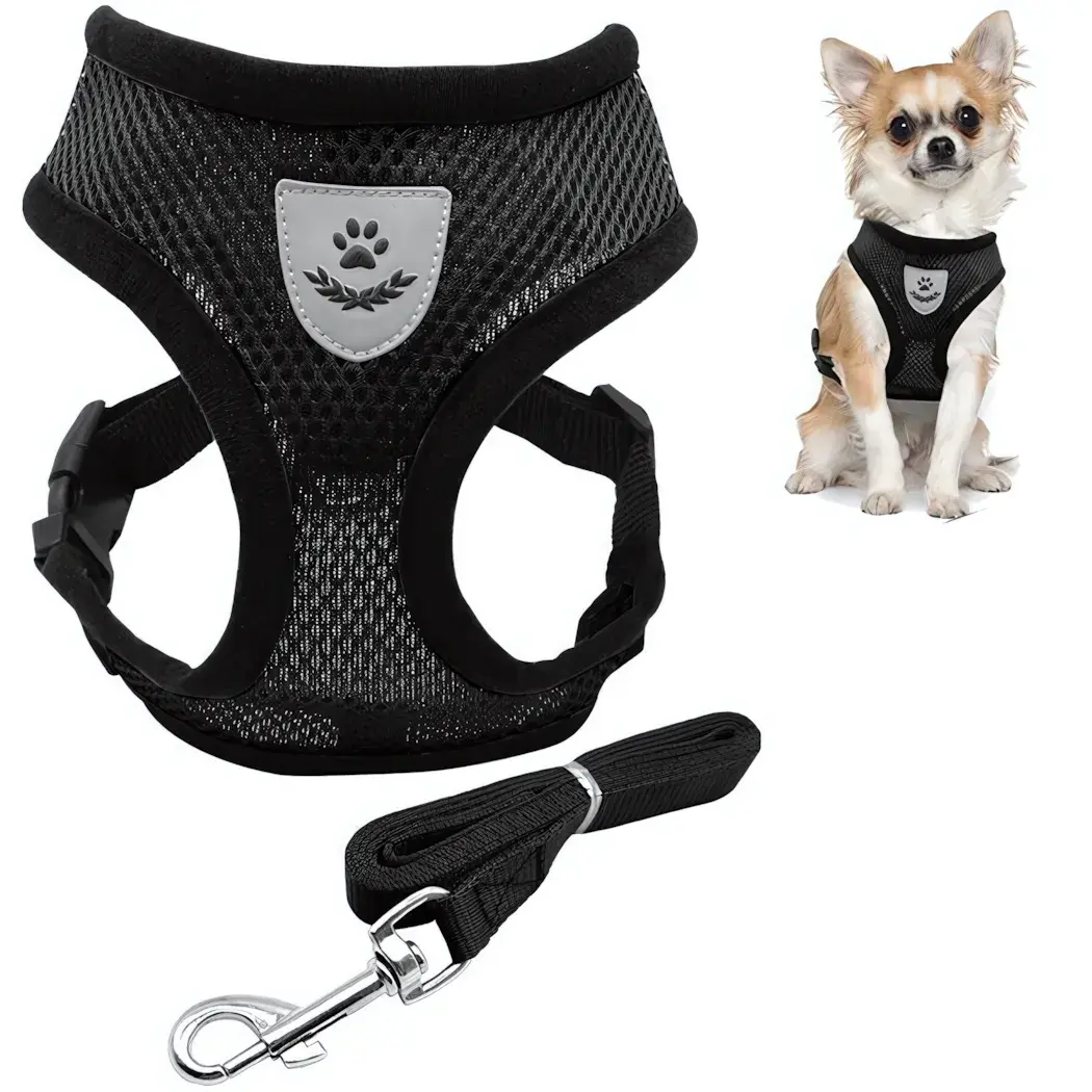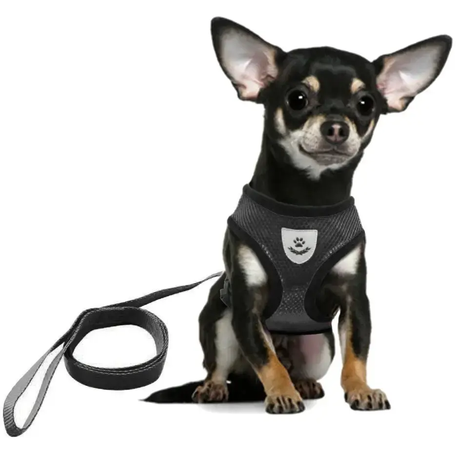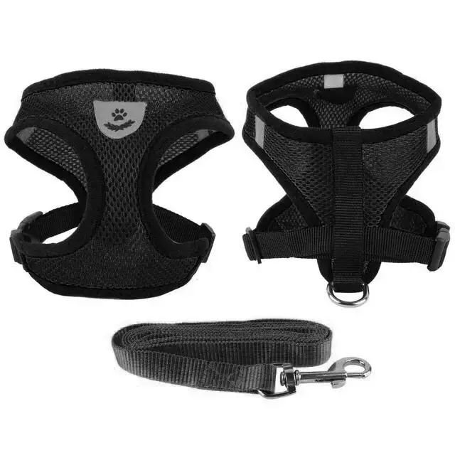 Комплект размера M подходит для чихуахуа, той-терьеров и других мелких пород. Поводок длиной 118 см дает свободу движений, сохраняя контроль. Легкая конструкция (нейлон + пластик) не утяжеляет собаку, а черный цвет практичен в уходе.