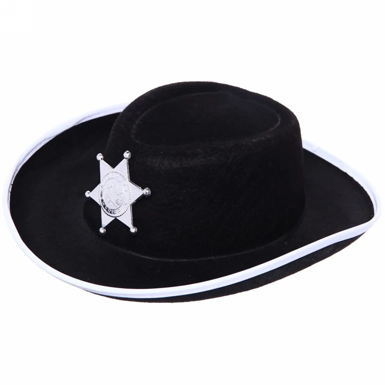 Шляпа выполнена из фетра или аналогичного материала, что обеспечивает ей долговечность и комфорт. Белая отделочная лента по краям придает изделию завершенный вид. Размеры шляпы не указаны, но она подходит для большинства взрослых и детских голов. Не упустите возможность стать центром внимания на вашем следующем празднике с карнавальной шляпой «Шериф»!