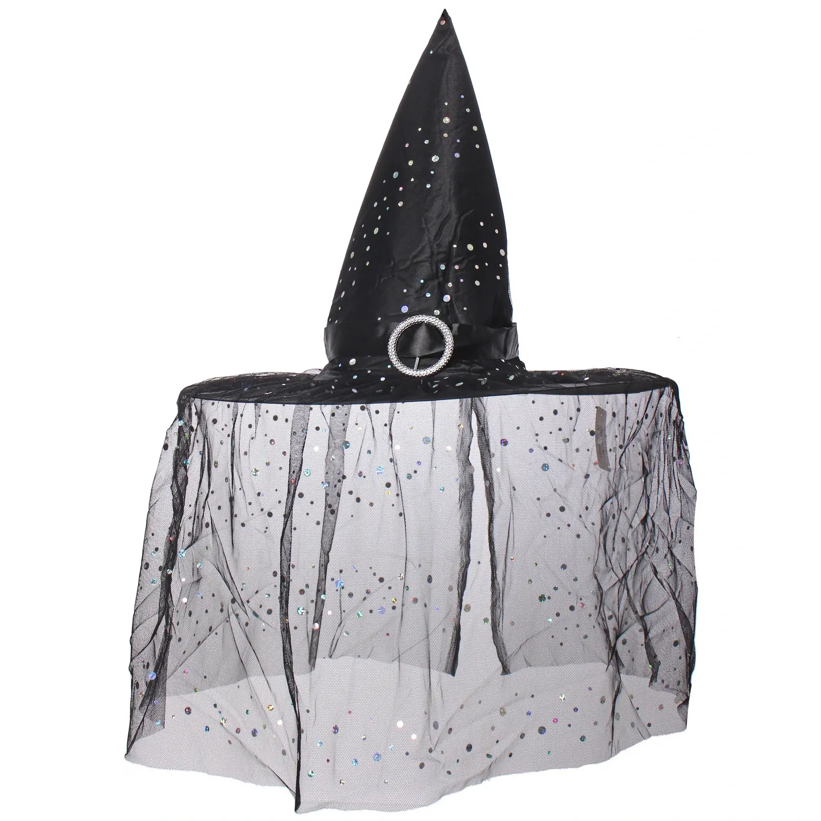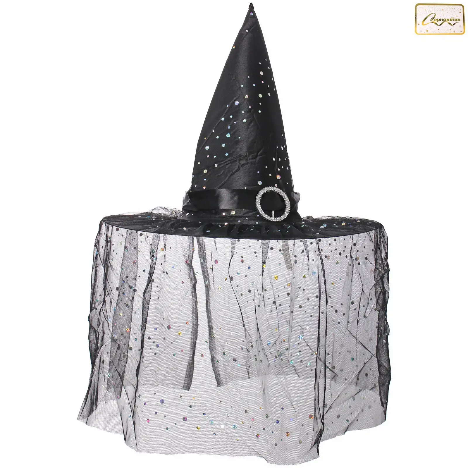 Шляпа имеет конусообразную форму с длинным верхом и широкими полями, что делает её характерной для ведьминских аксессуаров. Прозрачная юбка, украшенная блестками, добавляет шляпе легкости и воздушности. Размеры шляпы не указаны, но она предназначена для взрослого человека. Материалы, использованные в производстве, включают текстиль и синтетические компоненты, что обеспечивает долговечность и привлекательный внешний вид.