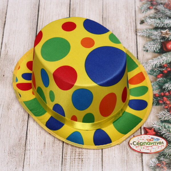 Шляпа имеет цилиндрическую форму с широкими полями и украшена гладкой лентой по краю. Цвет шляпы — желтый с разноцветными пятнами: красными, зелеными, синими и оранжевыми. Она идеально подходит для демонстрации на голове и станет ярким акцентом вашего образа. Не упустите возможность добавить этот стильный аксессуар в свою коллекцию!