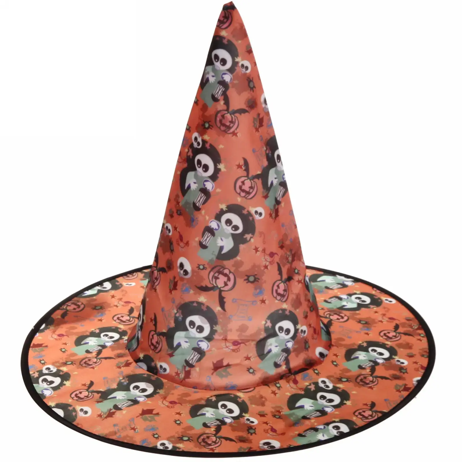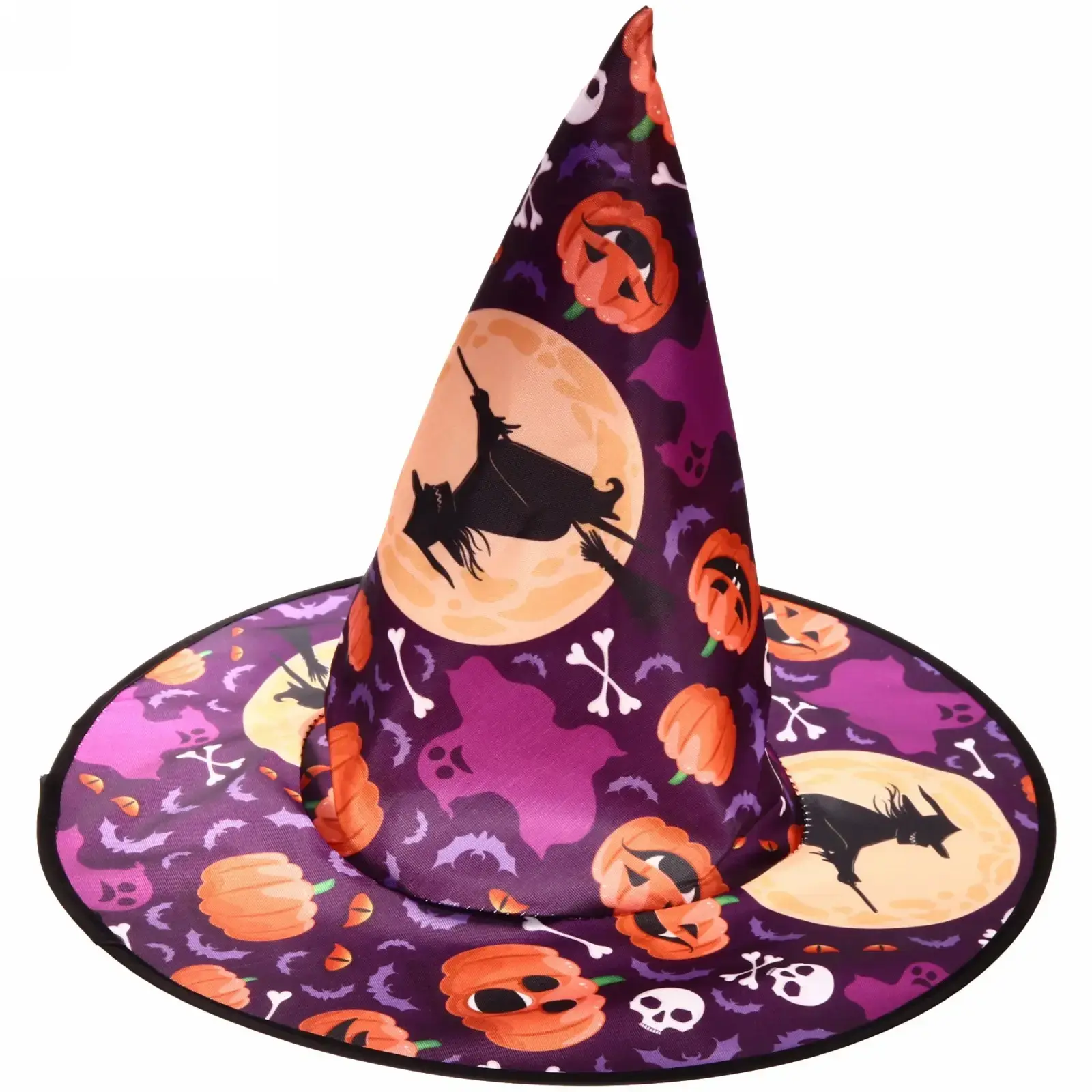 Шляпа имеет конусообразную форму с широкими полями, что делает её удобной для ношения. Основной цвет — фиолетовый, а принт включает в себя пугающие элементы, такие как тыквы и черепа, что идеально подходит для Хэллоуина. Размер шляпы универсален, что позволяет использовать её для различных мероприятий. Не упустите возможность стать центром внимания на празднике с этой яркой шляпой!