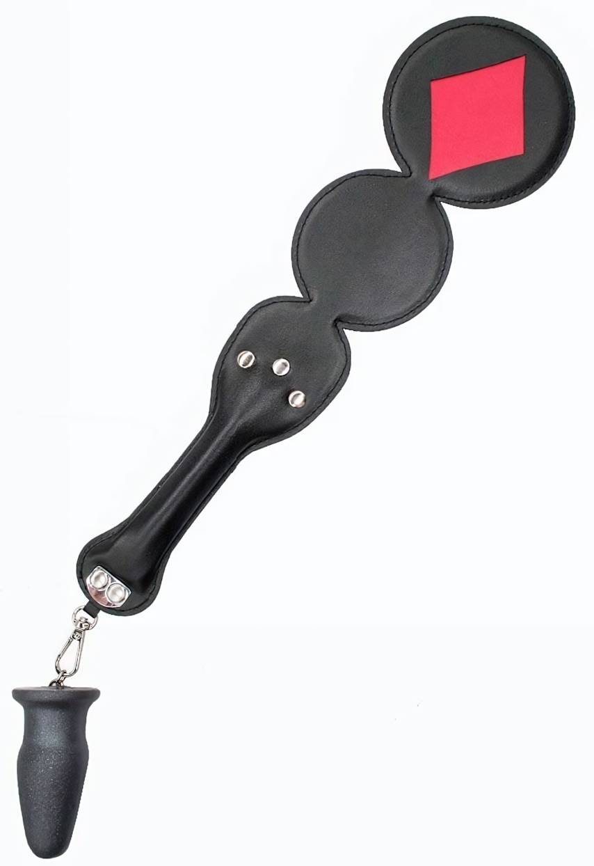 Шлёпалка Бубны с анальным плагом выполнена в традиционном стиле и подходит под любые аксессуары BDSM. Цвет: черный с красным; материал: полиуретан. Этот товар станет отличным дополнением к вашим интимным моментам и поможет раскрыть новые грани удовольствия.
