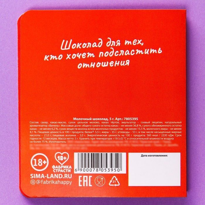 Шоколад весом 5 гр упакован в яркую открытку, которая привлекает внимание. Внутри открытки находится шоколад, который сделан из молочного шоколада с добавлением натуральных ароматизаторов. Условия хранения: температура +18 (±3)°C и влажность не более 75%. Срок годности составляет 12 месяцев. Порадуйте своих близких и сделайте их день ярче с шоколадом «Любовь это»!