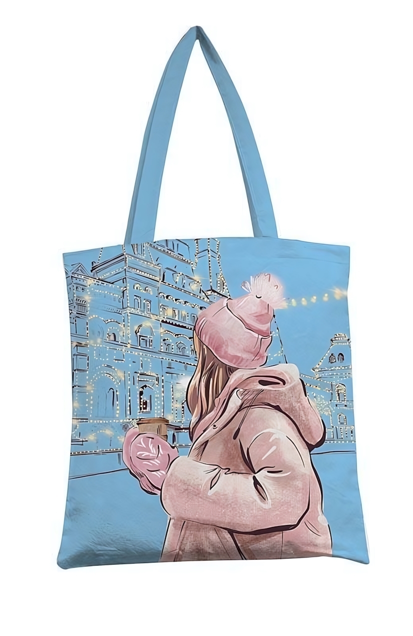 Размеры шоппера составляют 350х420 см, что делает его достаточно вместительным для различных нужд. Светло-голубой цвет и графический стиль принта с силуэтом человека в розовой шапке и пуховике создают уникальный и запоминающийся образ. Этот шоппер станет отличным выбором для тех, кто ценит качество, стиль и практичность в одном изделии.
