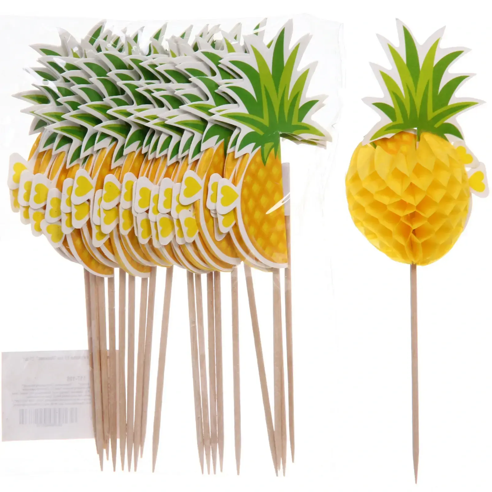 В упаковке содержится 20 шпажек, каждая из которых имеет уникальный дизайн с текстурой ананаса и зелеными листьями. Размер шпажек составляет 10 см, что делает их универсальными для различных закусок. Упаковка оформлена в ярком, праздничном стиле, что подчеркивает их декоративную функцию и делает их отличным подарком для любителей кулинарии.