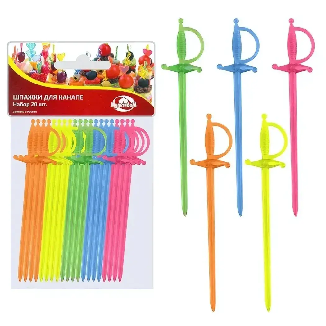 Благодаря компактному размеру (70мм) шпажки удобно использовать с различными закусками. Яркие цвета в ассортименте создают праздничное настроение. В наборе 20 штук – оптимальное количество для полноценной сервировки.