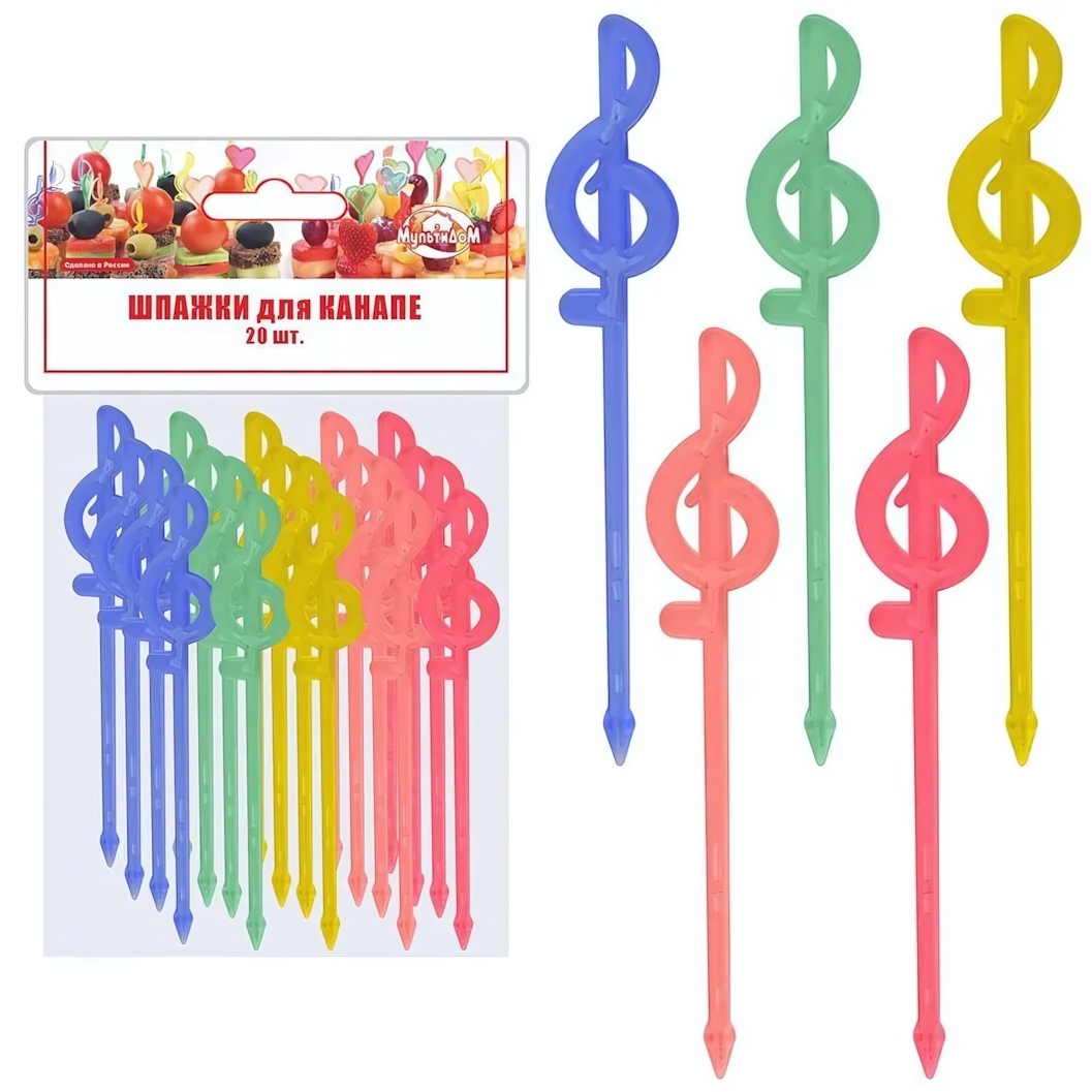 Шпажки для канапе «Скрипичный ключ» помогут превратить обычные закуски в стильное украшение праздничного стола. Изящная форма в виде музыкального символа добавляет сервировке оригинальности и создает атмосферу праздника — будь то день рождения, фуршет, вечеринка или семейный ужин.