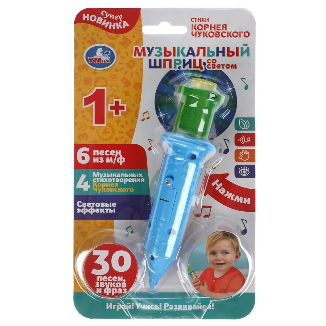 Подарите вашему малышу радость и развитие с музыкальным шприцем от ТМ «УМка». Эта развивающая игрушка не только развлекает, но и обучает, наполняя дни вашего ребенка веселыми мелодиями и стихами К. Чуковского. С 30 звуками, фразами и песнями, шприц станет отличным спутником для игр и обучения.
