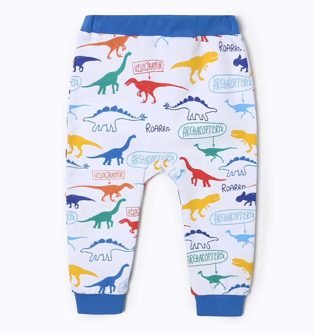 - Яркий дизайн: Белые штанишки с красочным принтом динозавров сделают образ вашего малыша стильным и запоминающимся.