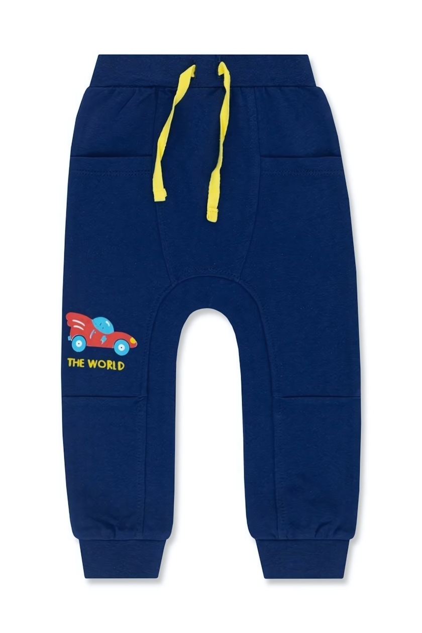 Штаны детские футер 100% хлопок, размер 74, темно-синий, эластичный пояс с завязками, декор автомобиль