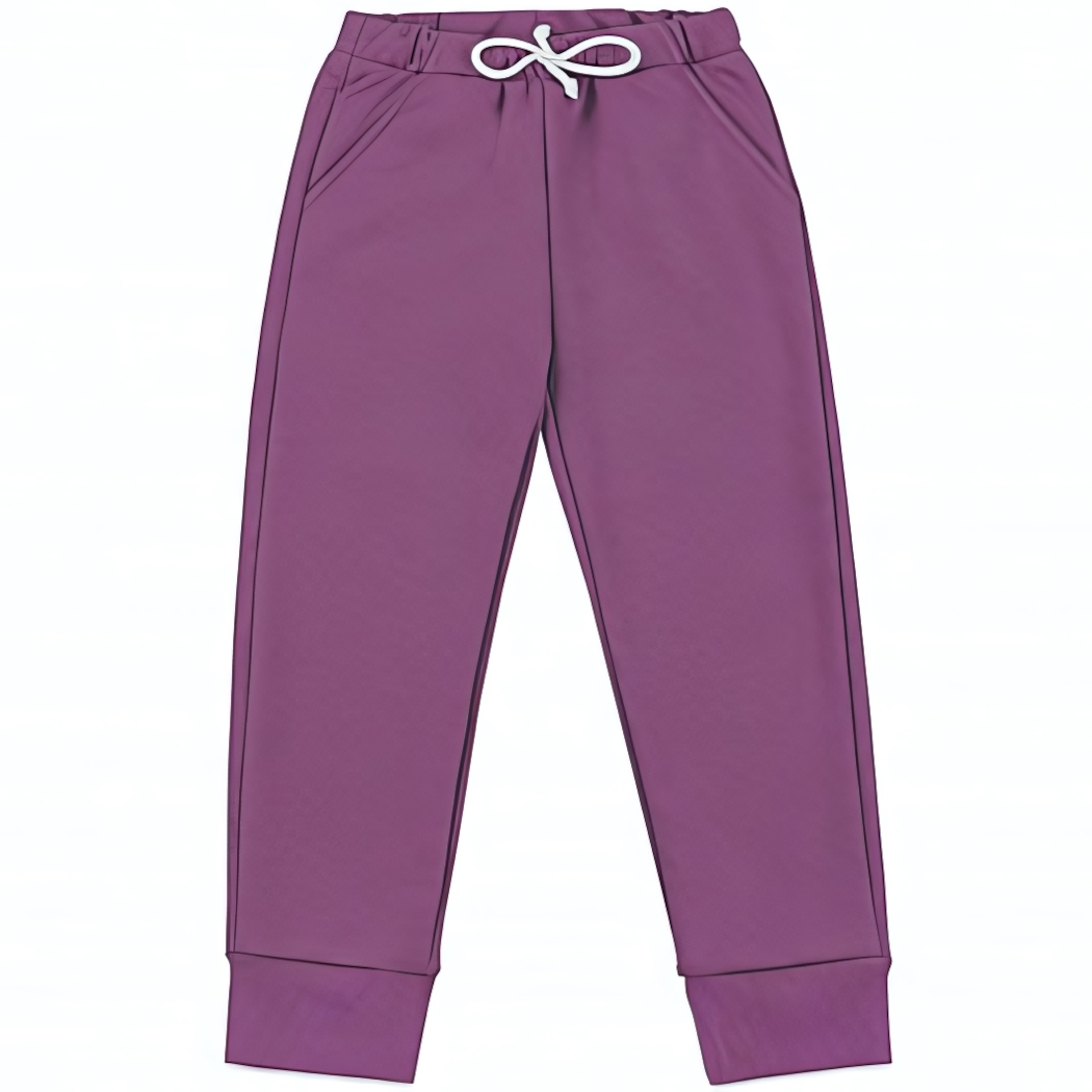 Мягкая внутренняя поверхность не раздражает кожу, а эластичная структура материала позволяет легко надевать и снимать штаны. Универсальный фиолетовый оттенок сочетается с любой одеждой, а прямой крой подходит для разных типов фигуры. Практичная модель для детского сада, прогулок и спортивных занятий.