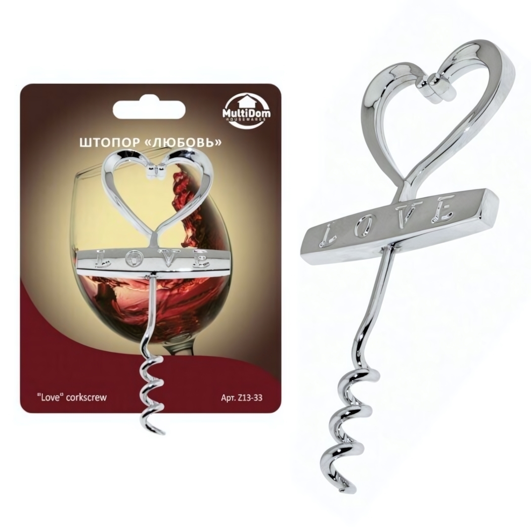 Штопор 'Любовь', сталь с хромированным покрытием, ручка-сердце для удобства
