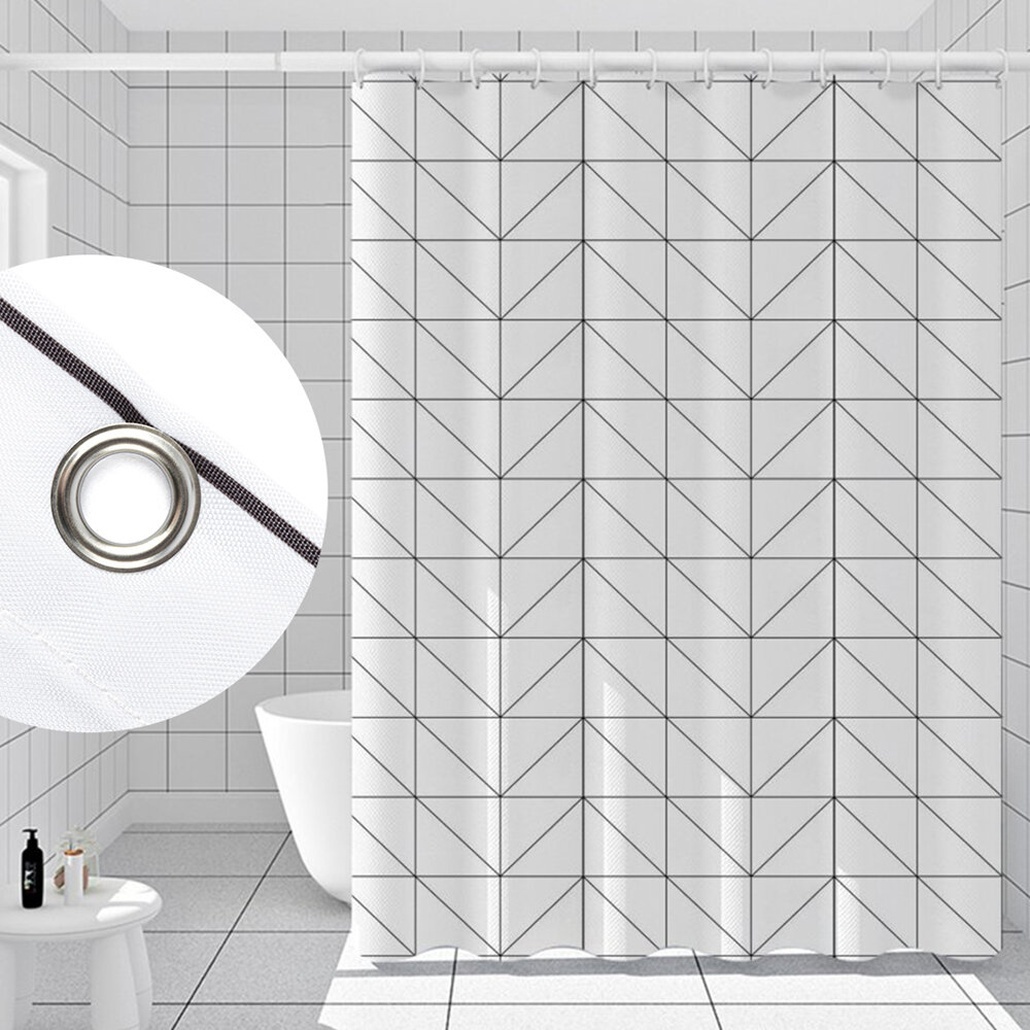 Штора с геометрическим узором создаёт гармоничный интерьер, сохраняя пол сухим во время водных процедур. 12 металлических колец обеспечивают плавное перемещение и надёжное крепление на карнизе.