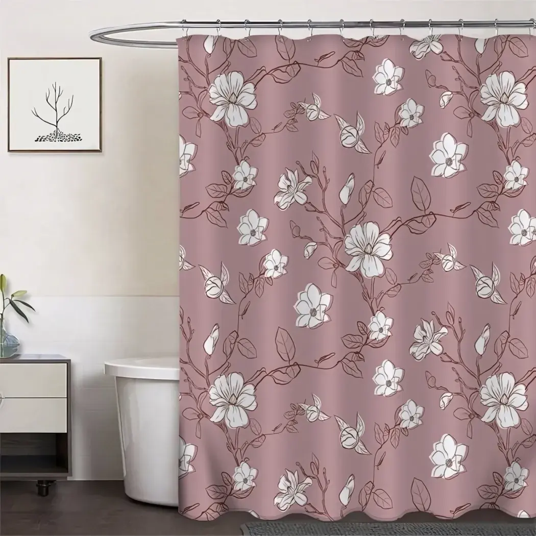 Эта штора имеет размеры 180х180 см, что делает её универсальной для большинства стандартных ванных комнат. Розово-коричневый фон с белыми цветами и зелеными листьями придаёт ей свежий и современный вид. Установка шторы проста и не требует специальных навыков — достаточно повесить её на карниз, и она готова к использованию.