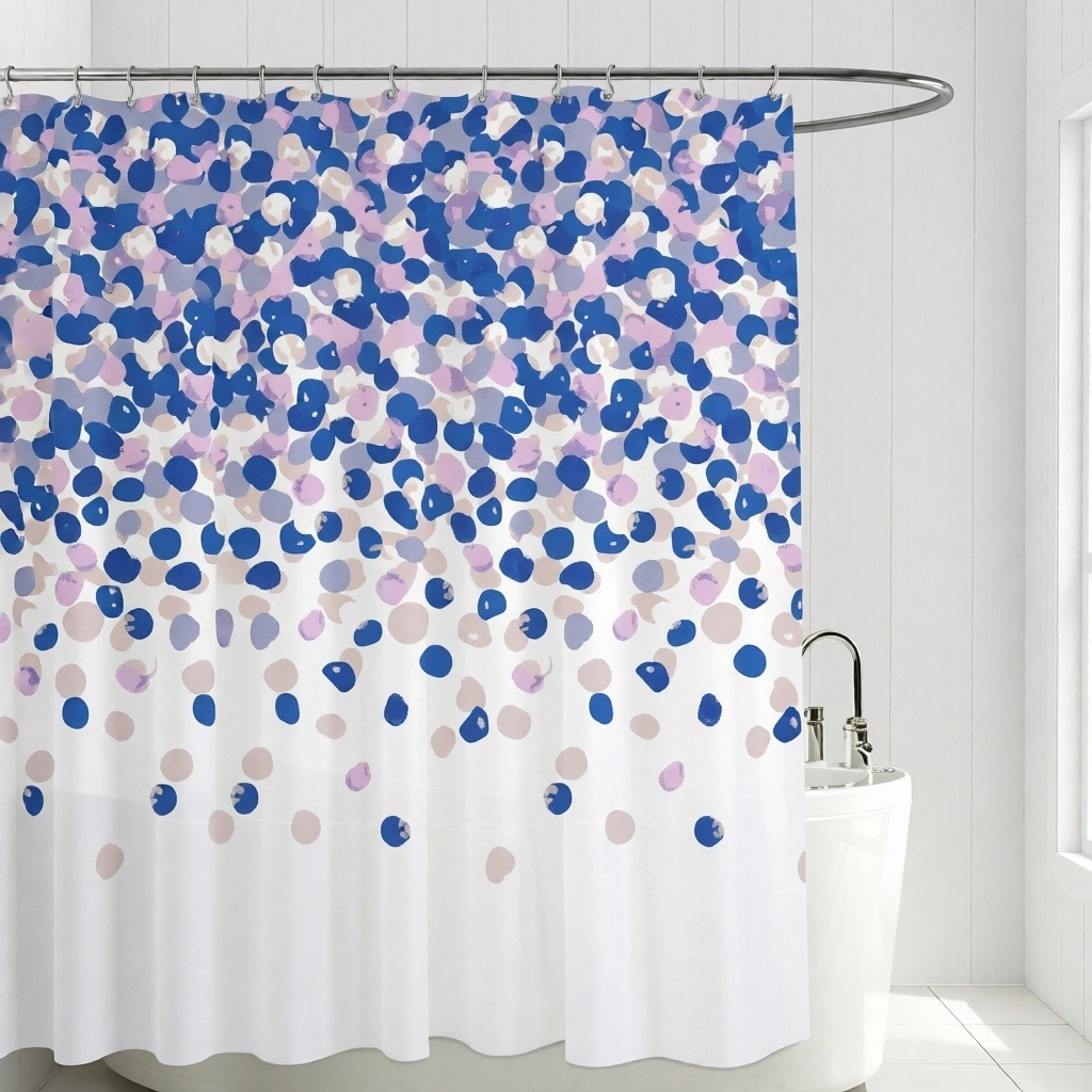 Стандартный размер 180х180 см подходит для большинства ванн и душевых кабин. Пластиковая основа не впитывает запахи и устойчива к плесени, а полупрозрачная текстура сохраняет естественное освещение в комнате. Градиентный переход от насыщенных оттенков к нежному фону визуально увеличивает пространство.